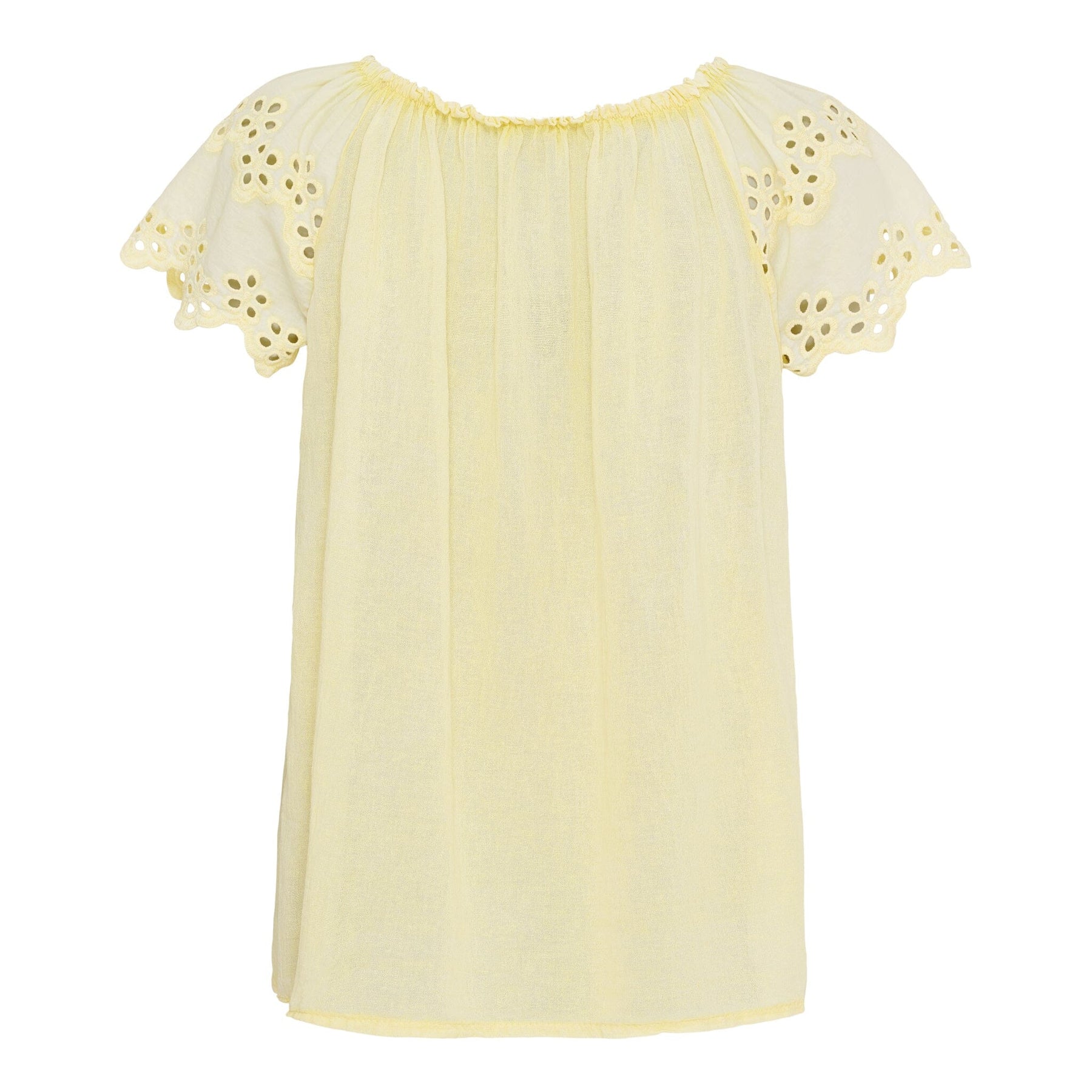 Gul bomullsbluse fra Marta Du Chateau med off-shoulder design og broderte ermer. Blusen har en løs passform og korte ermer med blomsterbroderi.