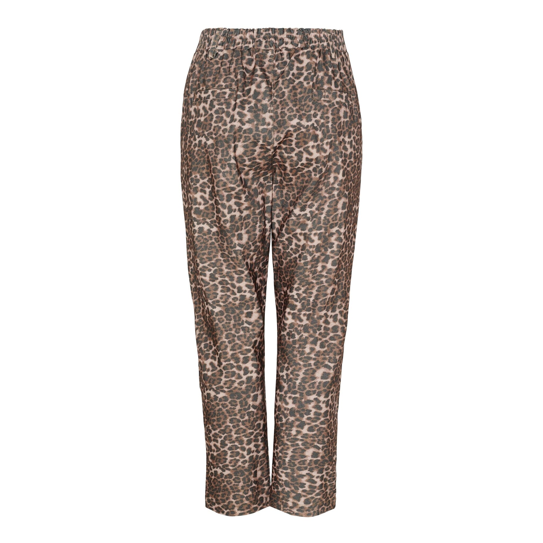 Bukser fra Marta Du Chateau med brunt leopardmønster. De lange buksene har lommer på forsiden og en blanding av glidelås og elastikk i midjen.