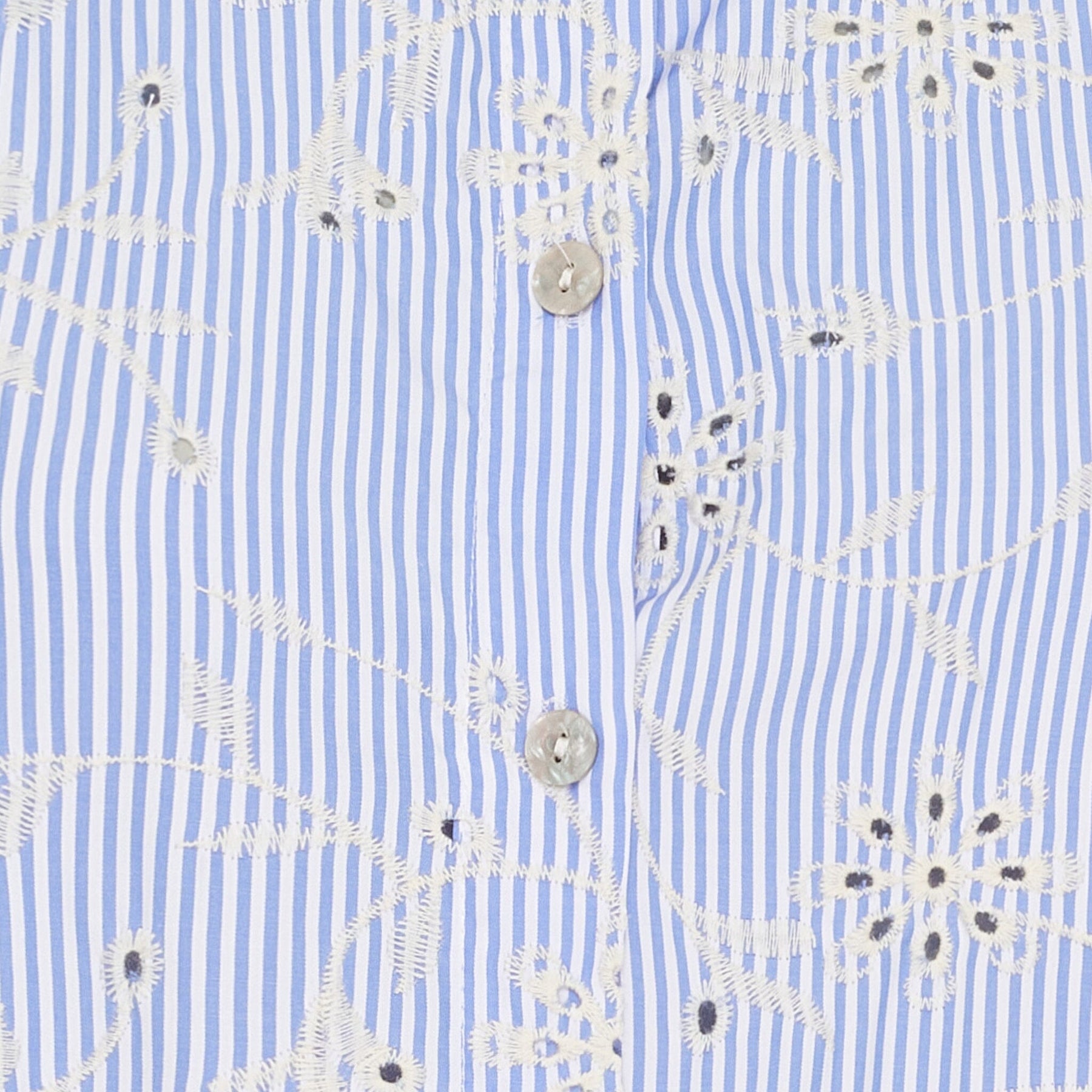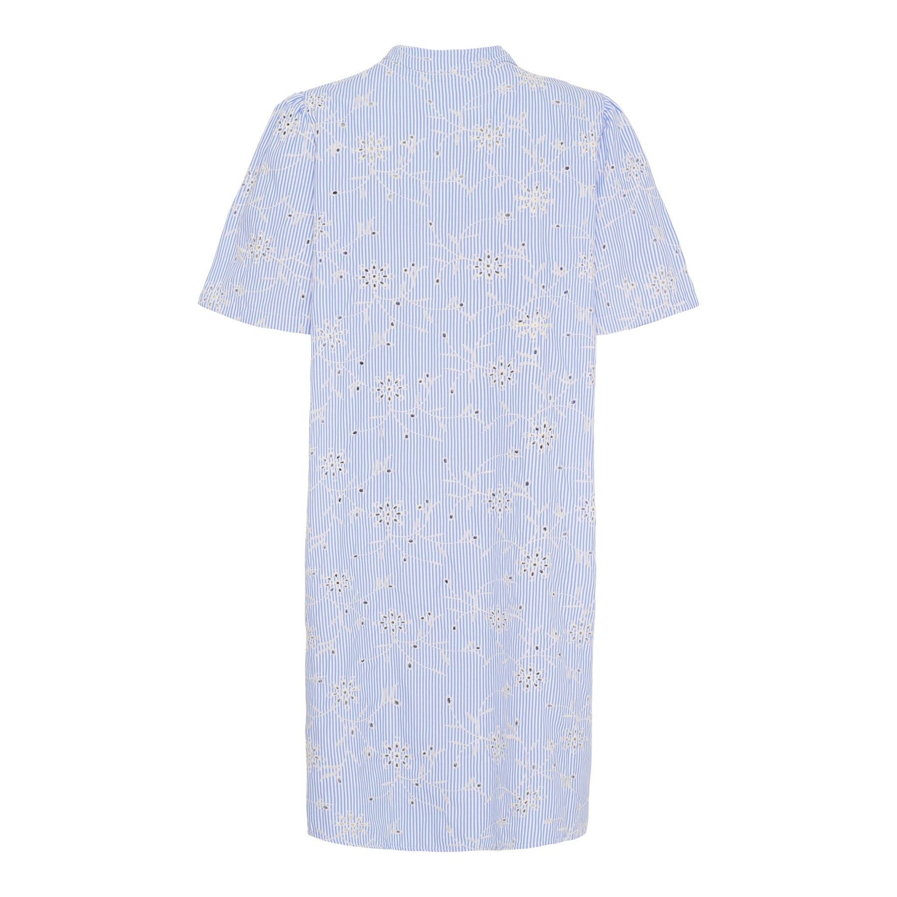 Knelang kjole fra Marta Du Chateau i lys blå med hvite striper. Kjolen har skjortekrage, knapplukking foran og korte ermer. Blomsterbroderiet gir et fint samspill med stripene.