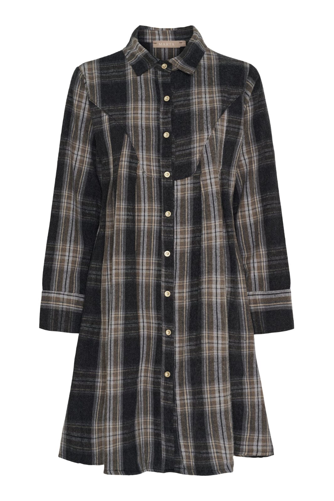Grå, rutete kjole fra Marta Du Chateau med skjortekrage og knappelukking foran. Kjolen har 3/4 ermer og rynker som gir den et feminint uttrykk.
