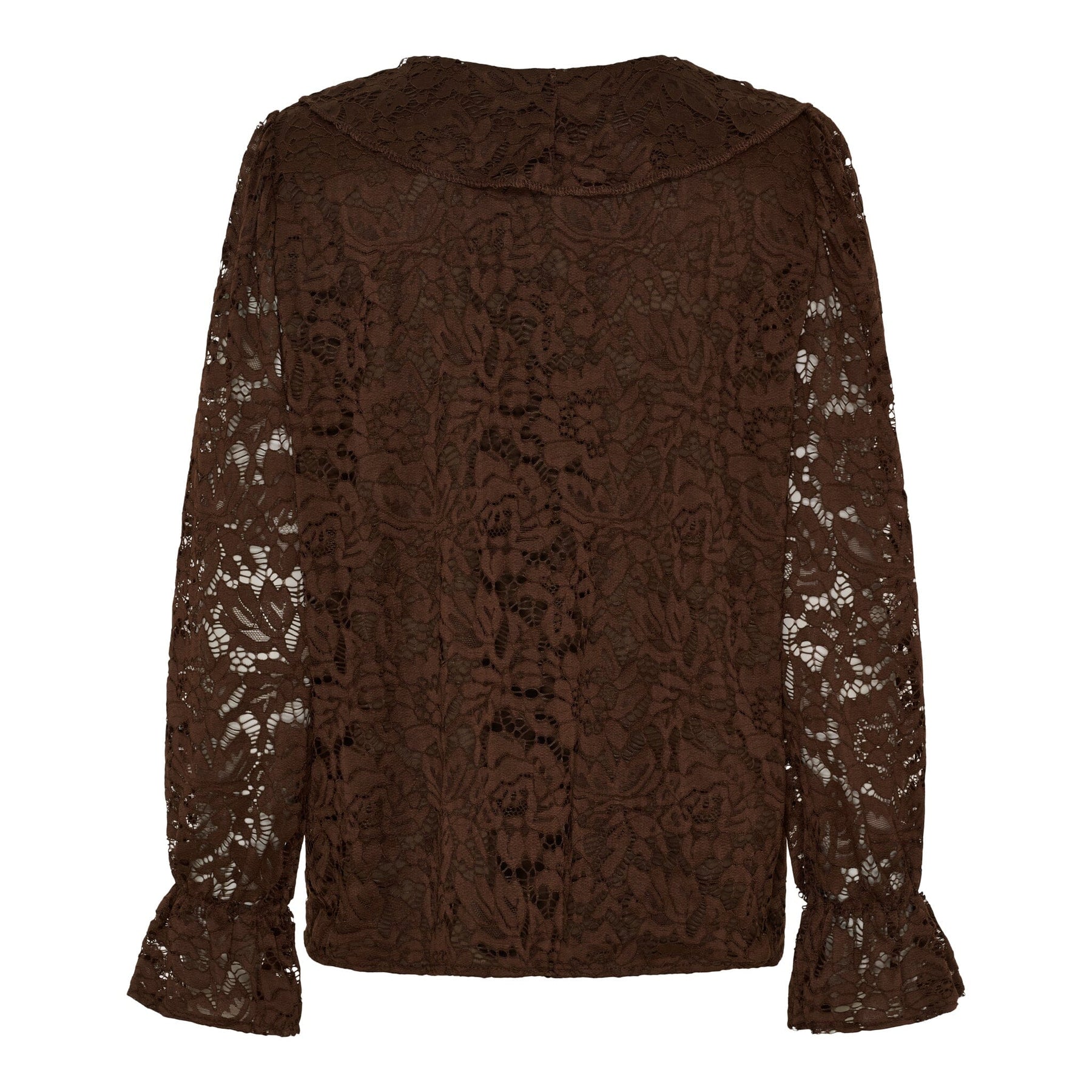 Brun blondebluse fra Marta Du Chateau med blomstermønster og volangdetaljer. Blusen passer til både formelle og avslappede anledninger samt festlige begivenheter.