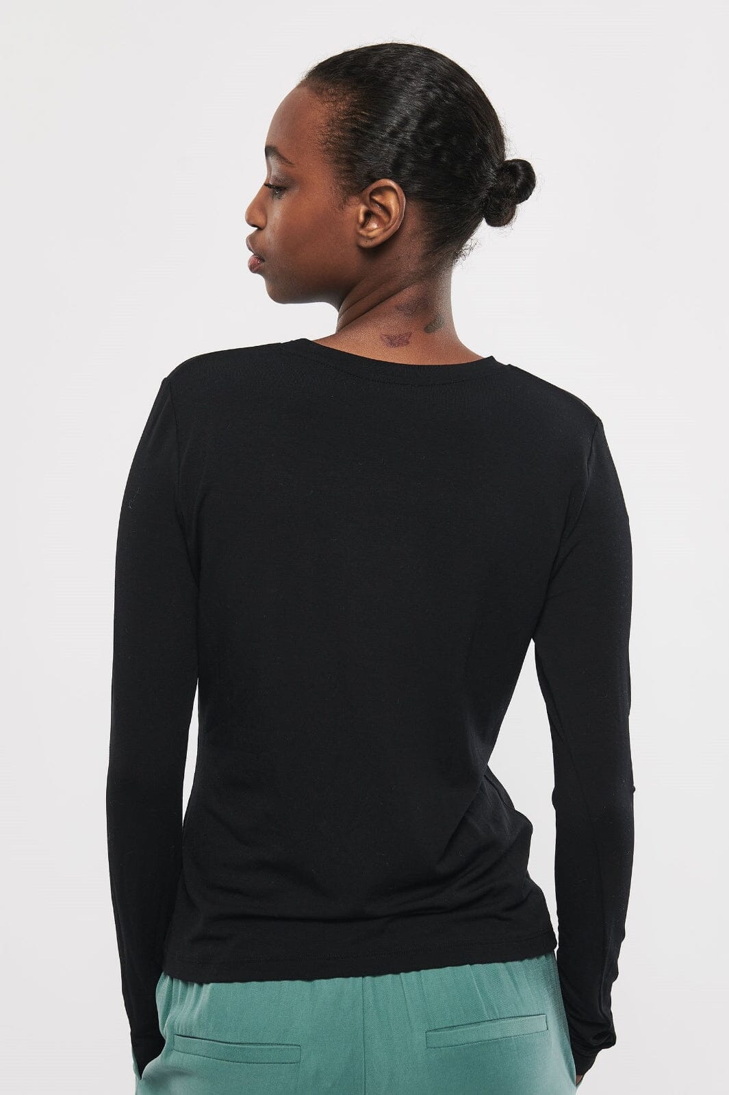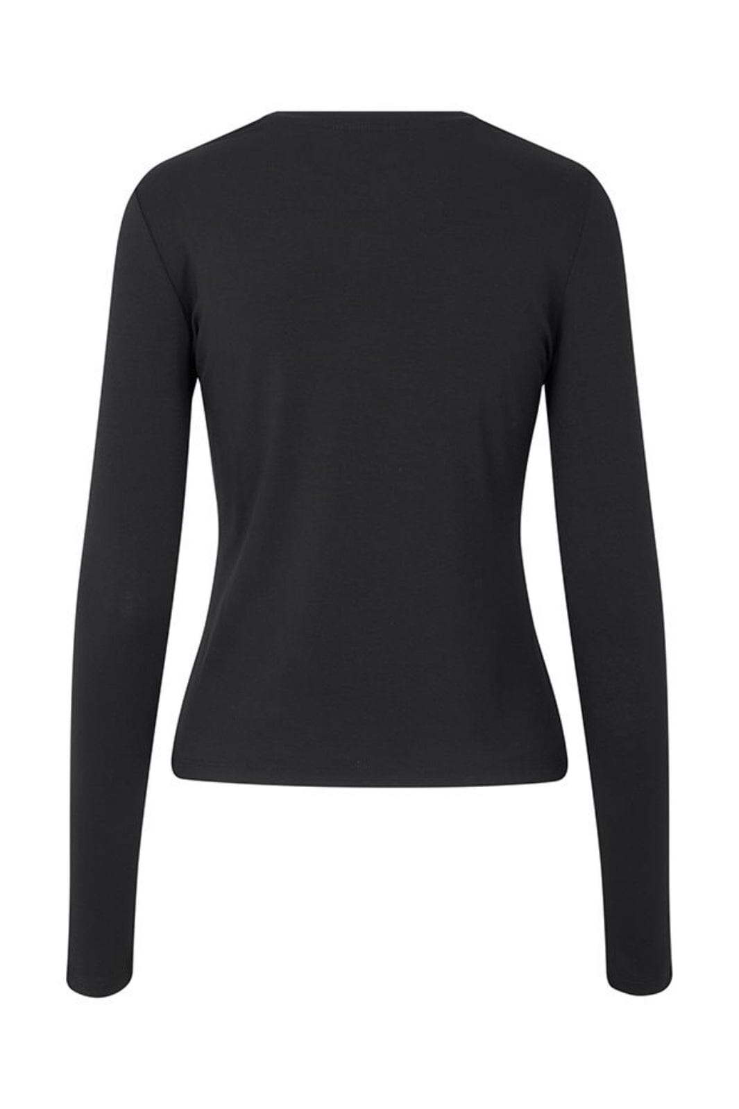 Svarte langermede bluse fra MbyM med rund hals. Blusen har en tettsittende silhuett og er laget av mykt og elastisk materiale som følger kroppens bevegelser.