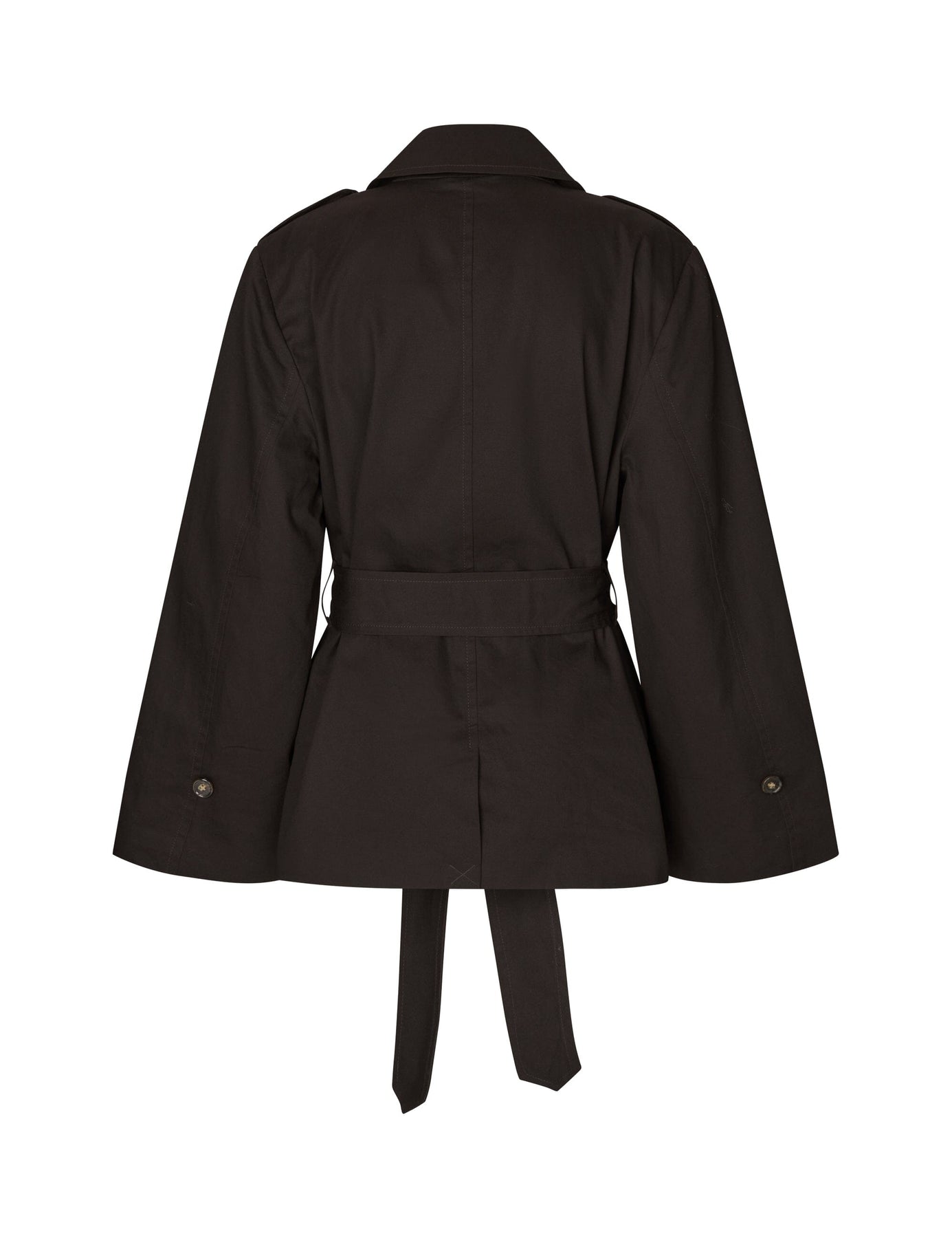 Brun jakke fra MbyM, laget av bomull. Jakken har et dobbeltkneppet design med belte i midjen og knytedetaljer.