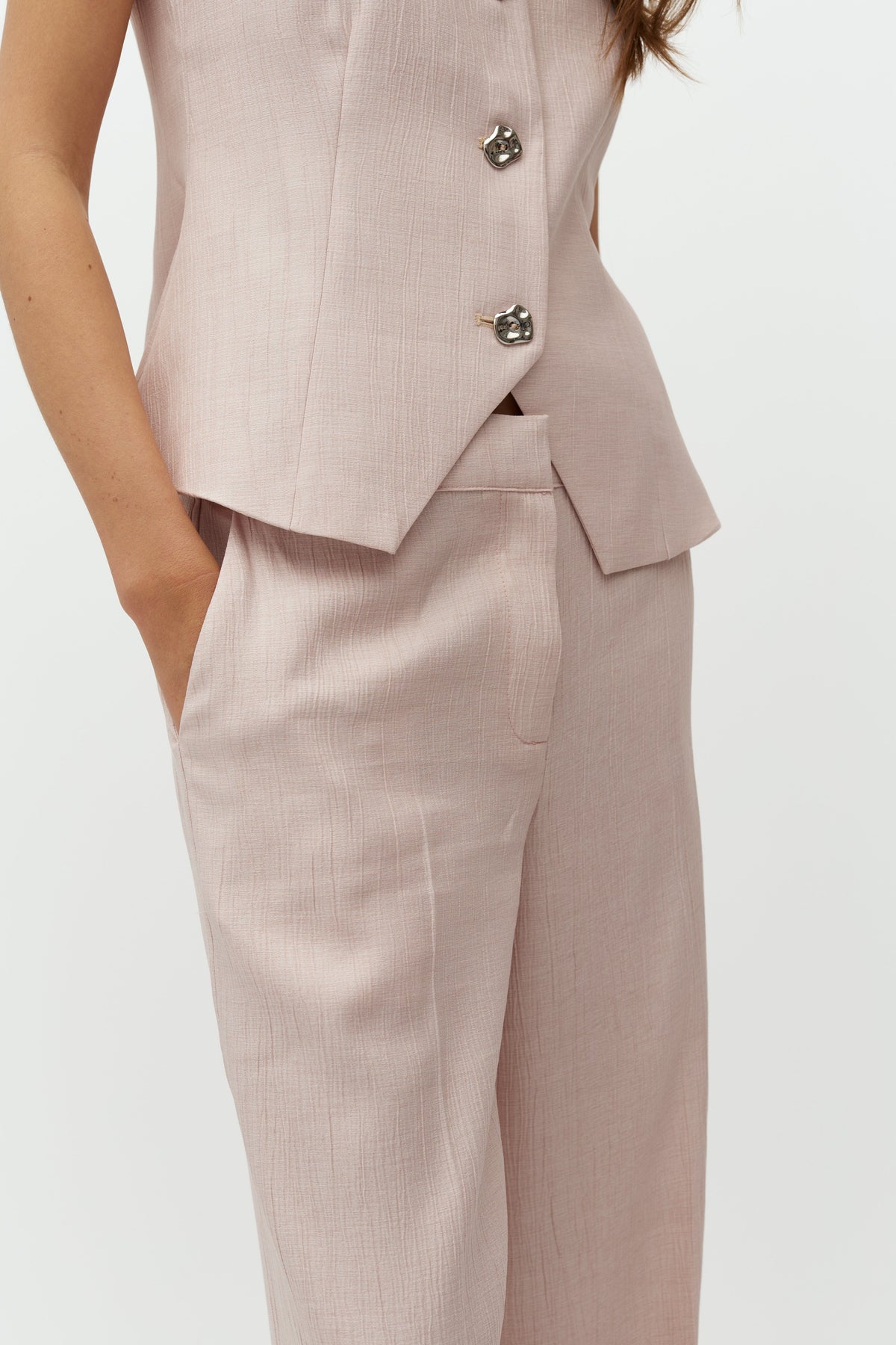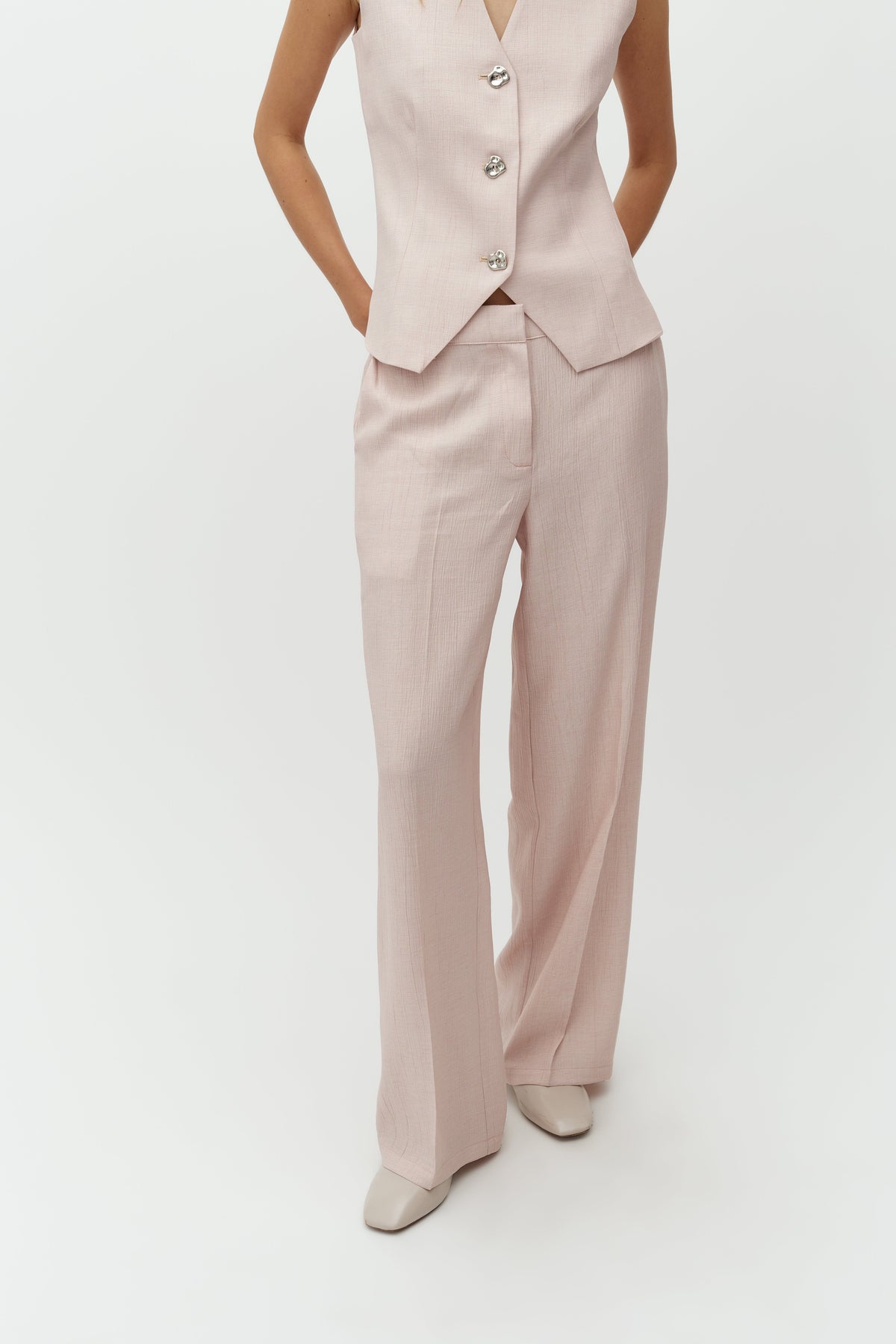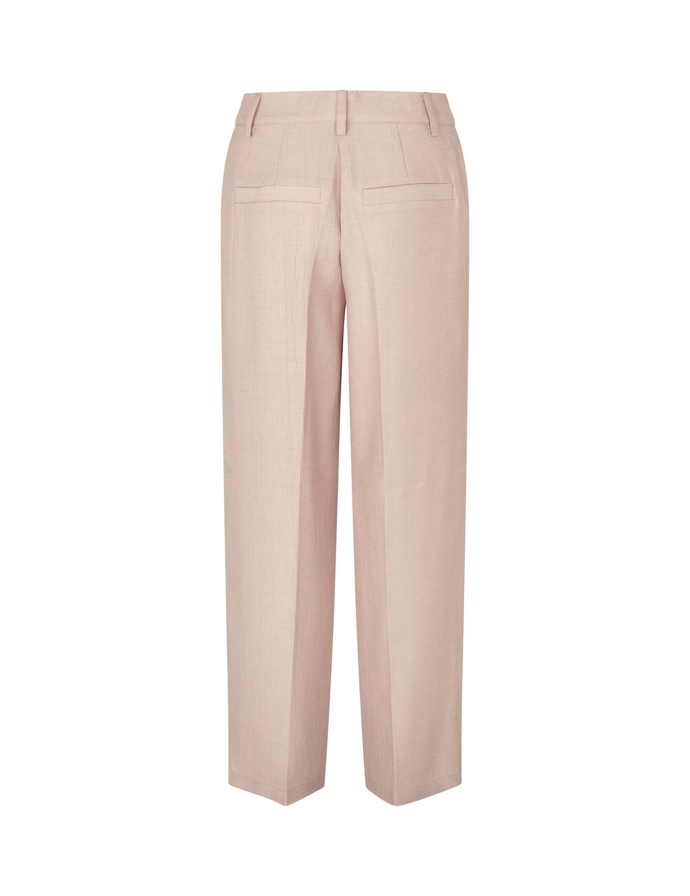 Rosa bukser fra MbyM i en melert rød-rosa nyanse. Buksene har en løs passform, høy midje og gulvlengde.