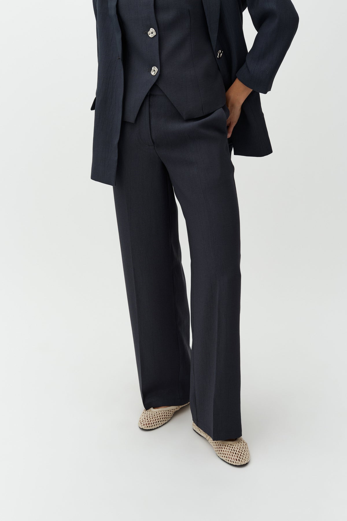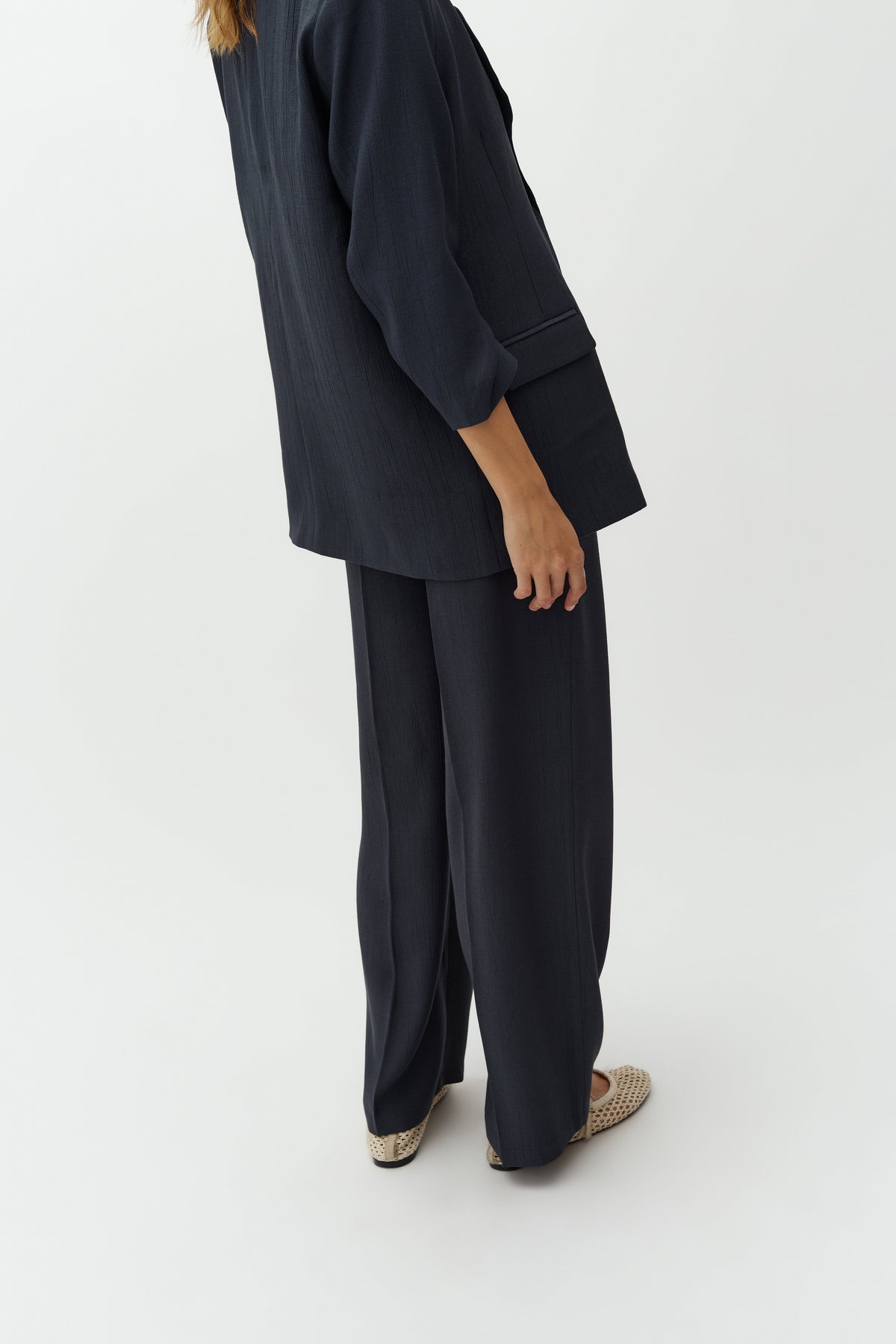 Bukser fra MbyM med pinstripe-mønster i en mørk blågrønn nyanse. Buksene er laget av en blanding av polyester og viskose.