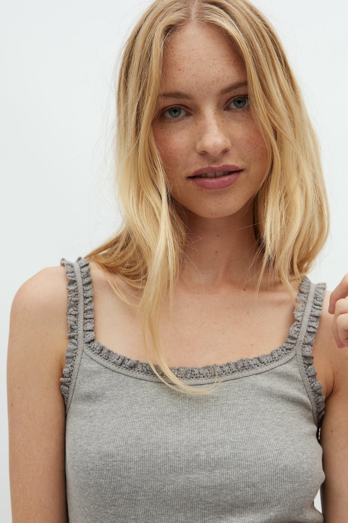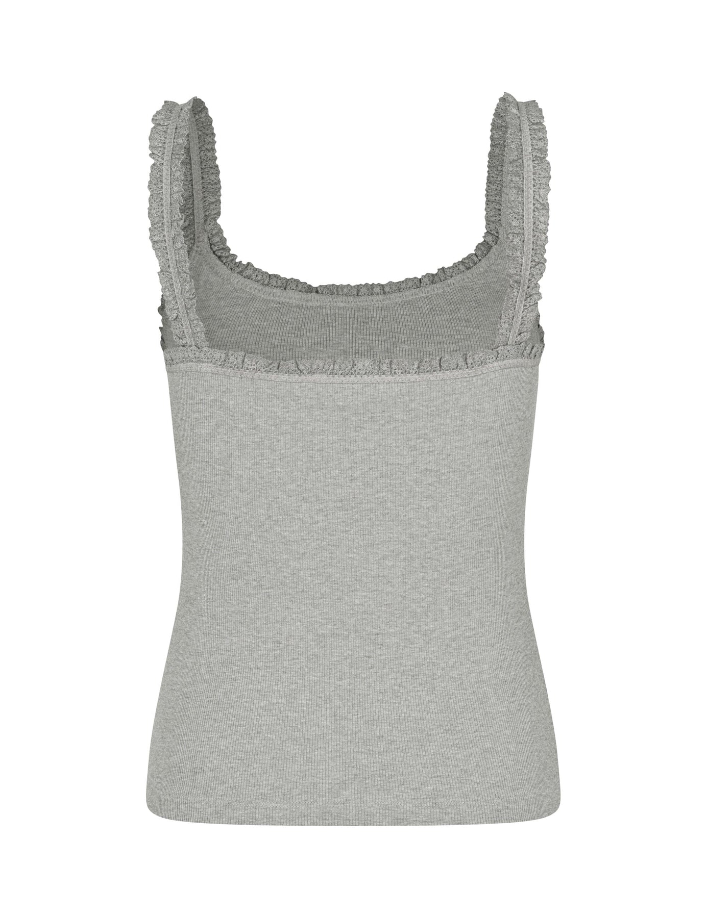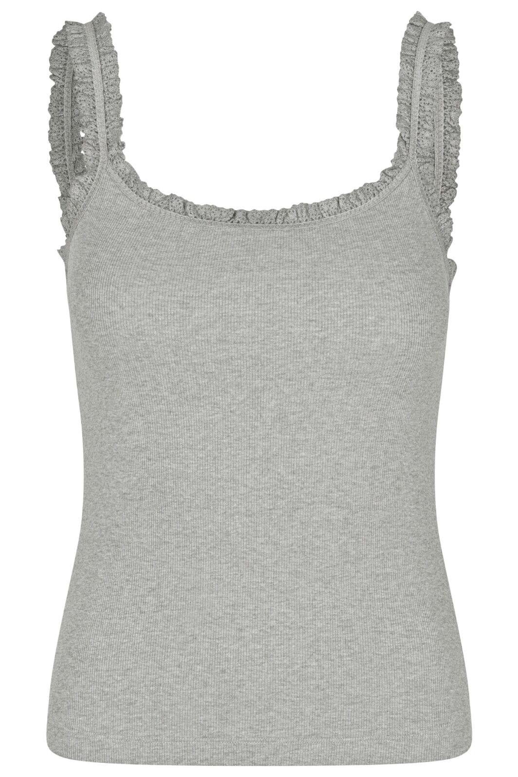 Grå tanktop fra MbyM med firkantet utringning og volanger på stroppene. Toppen er laget i en myk, melert kvalitet med en behagelig passform.