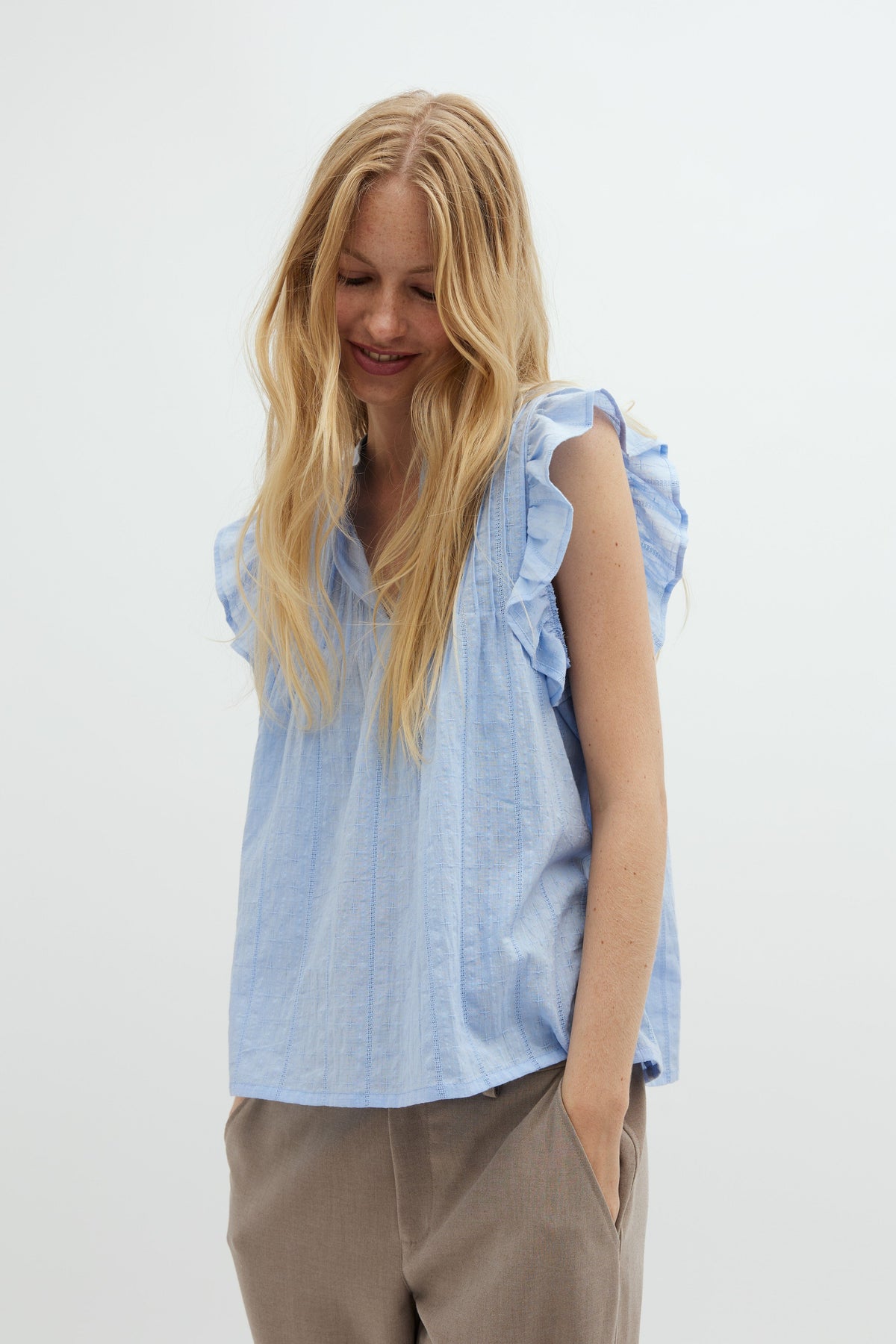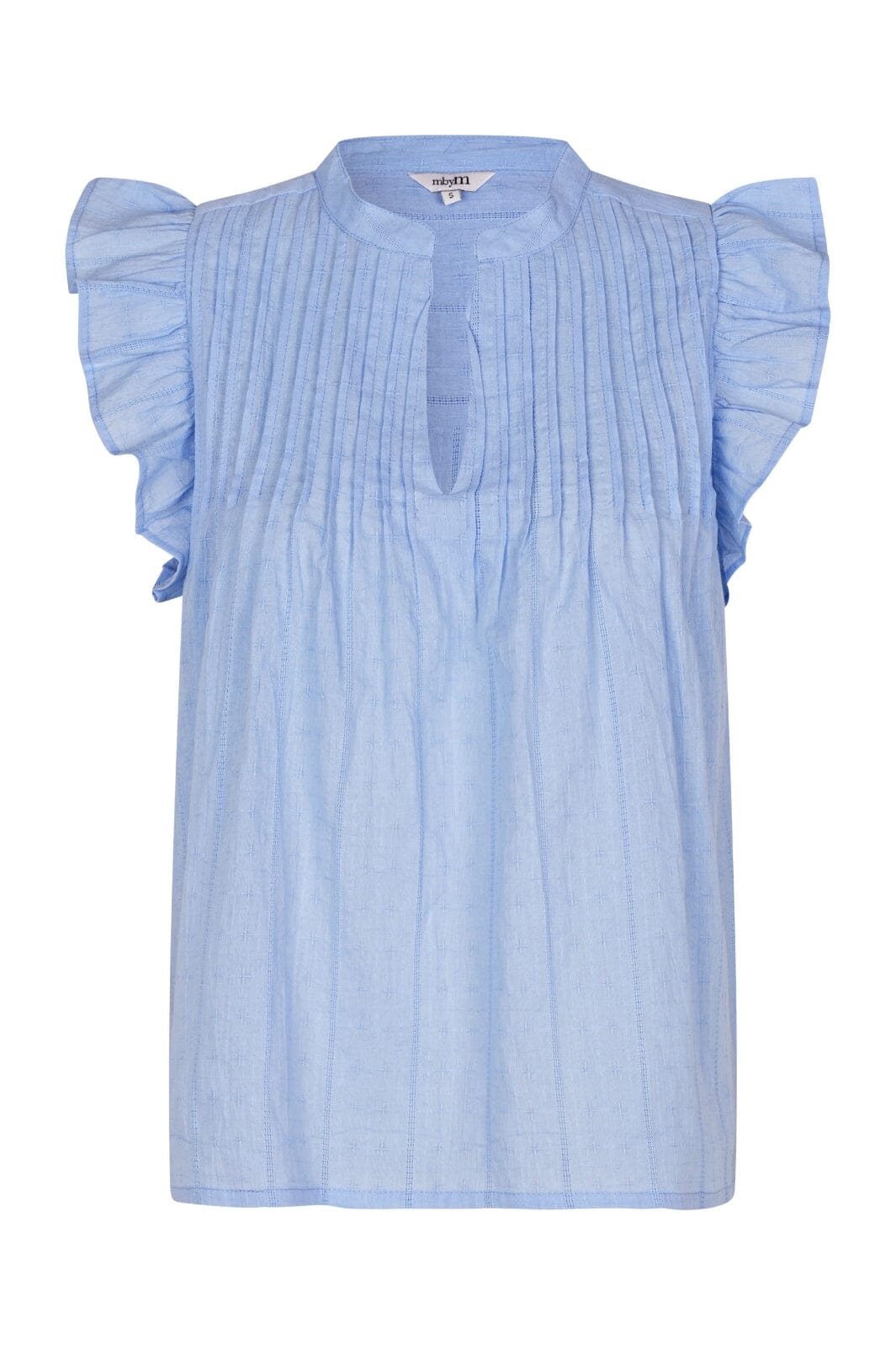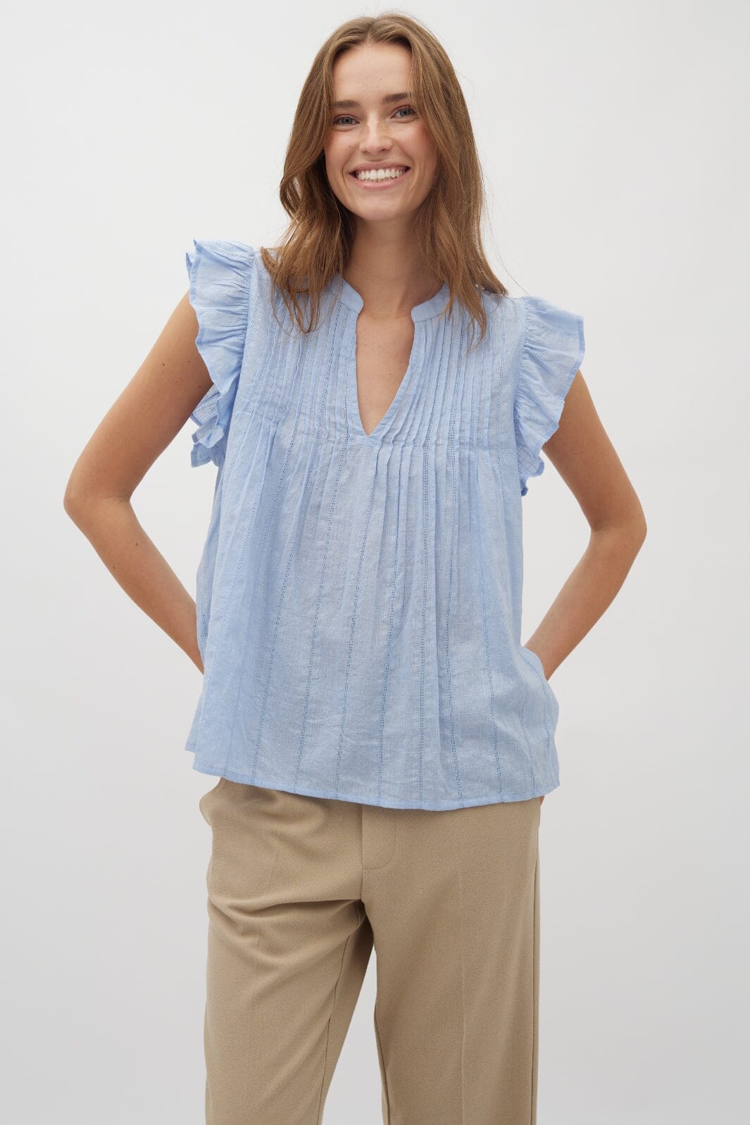 Lys blå bluse fra MbyM med nålestriper og volangdetaljer. Blusen har en plissert front og dekorative sømmer som gir den karakter. V-halsutskjæring og ermeløs design.