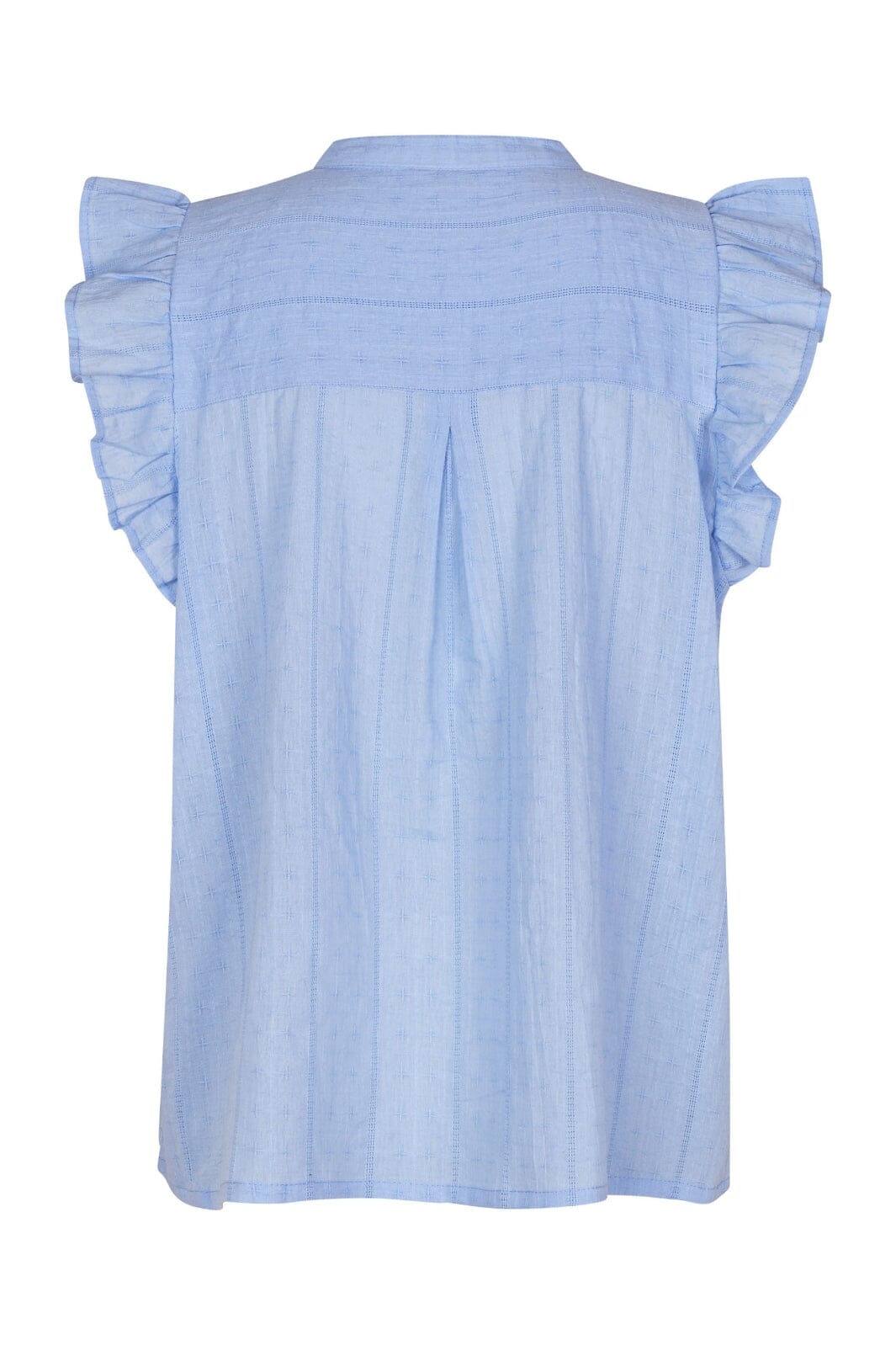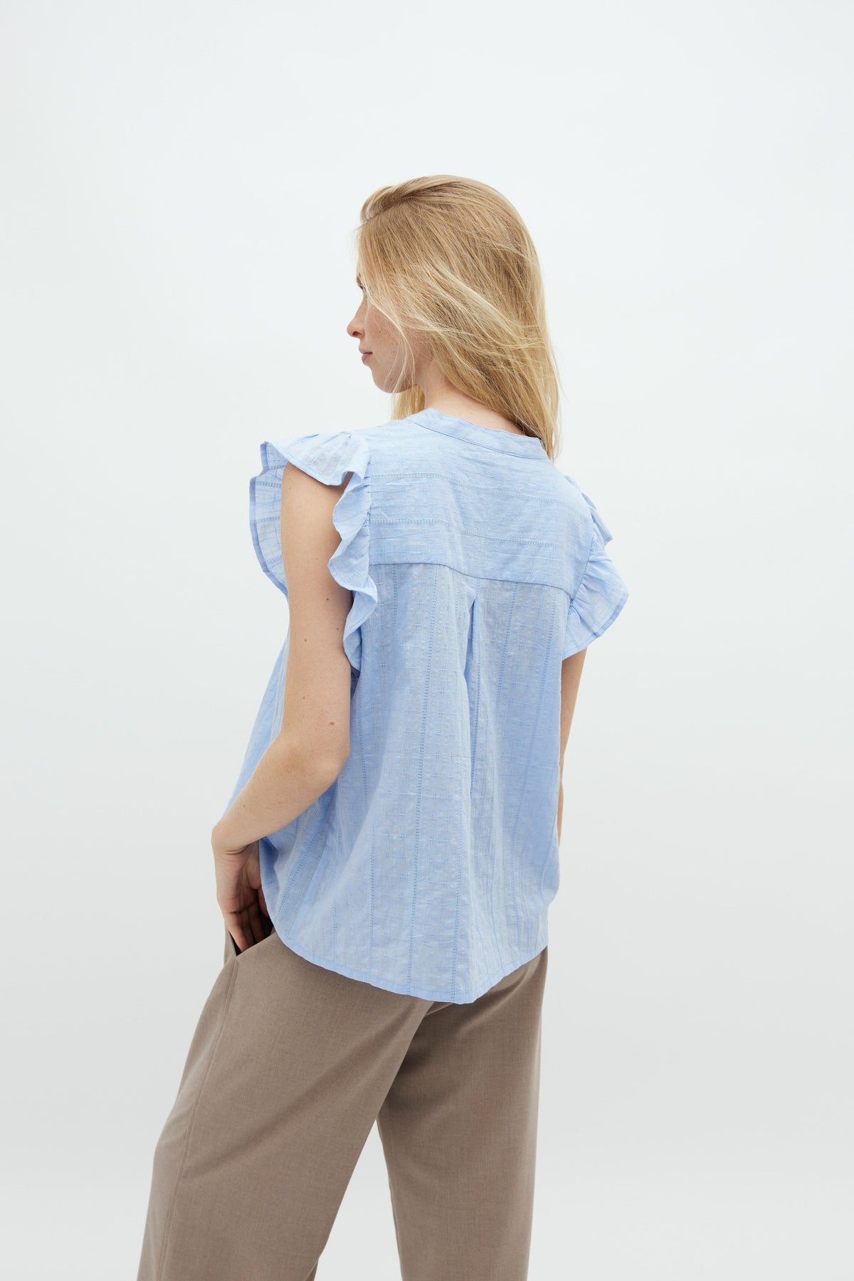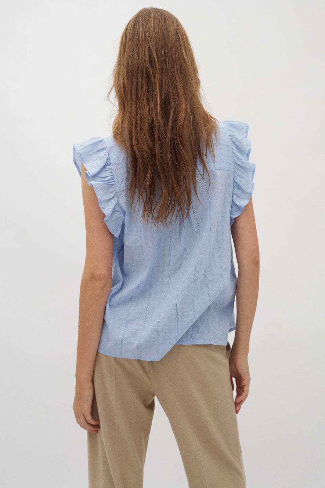 Lys blå bluse fra MbyM med nålestriper og volangdetaljer. Blusen har en plissert front og dekorative sømmer som gir den karakter. V-halsutskjæring og ermeløs design.