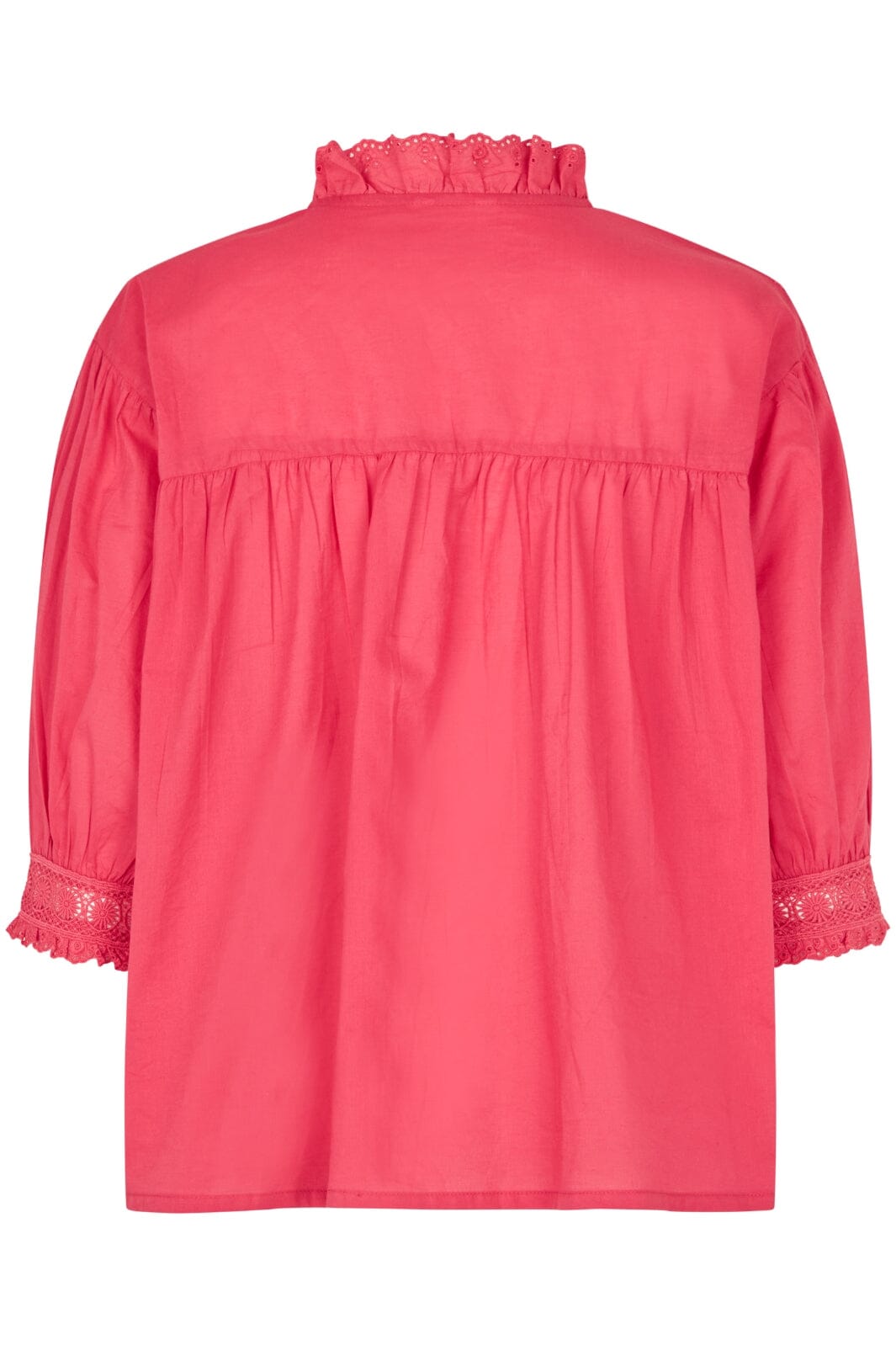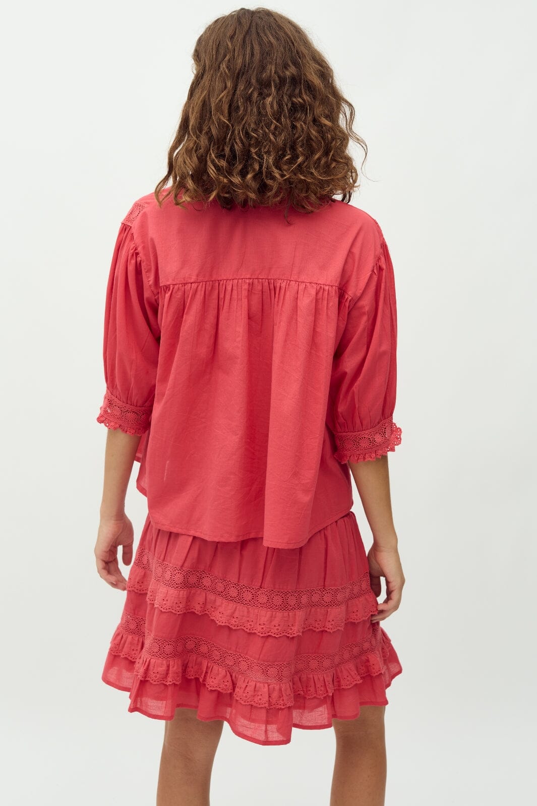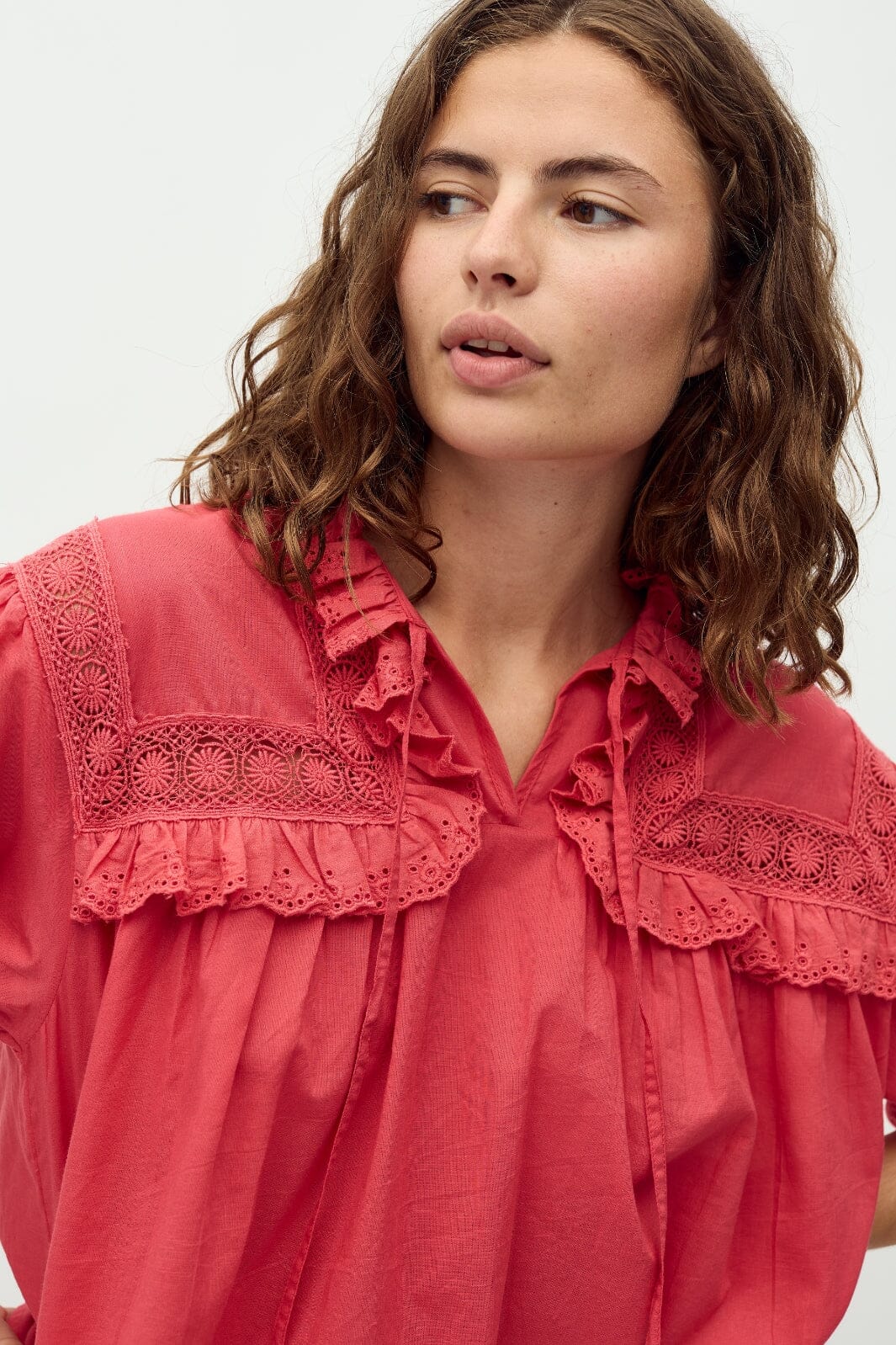 Rød bomullsbluse fra MbyM i fargen Red Candy. Blusen har en høy krage med volanger, blondedetaljer langs skuldrene og et bindebånd ved V-utskjæringen.