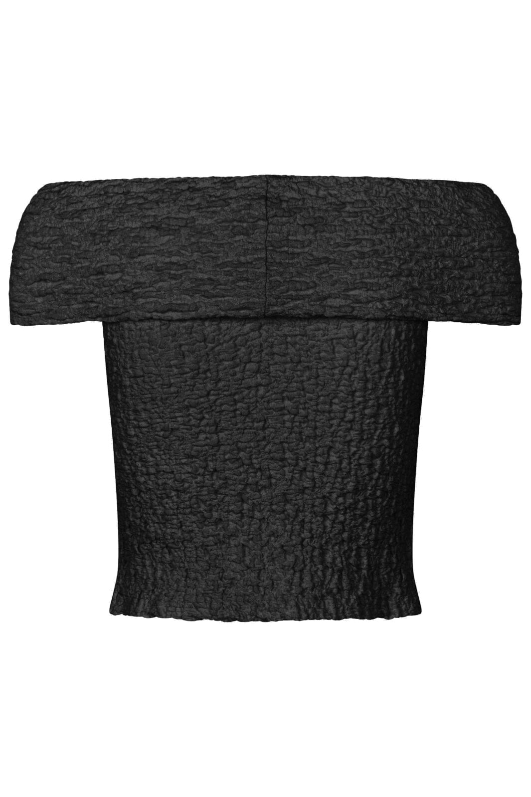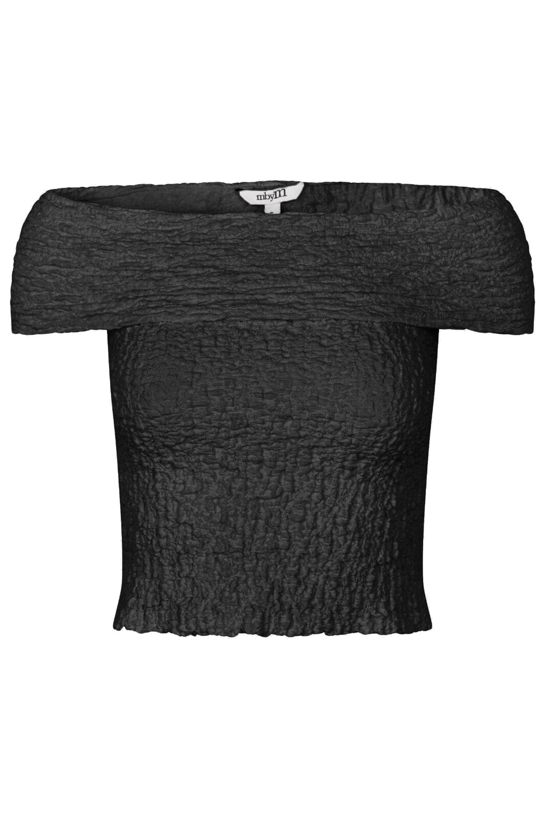 Svar off-shoulder topp fra MbyM med rynket tekstur og volanger. Toppen har en strukturert overflate med bølgede detaljer som gir den et unikt uttrykk.