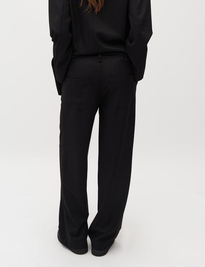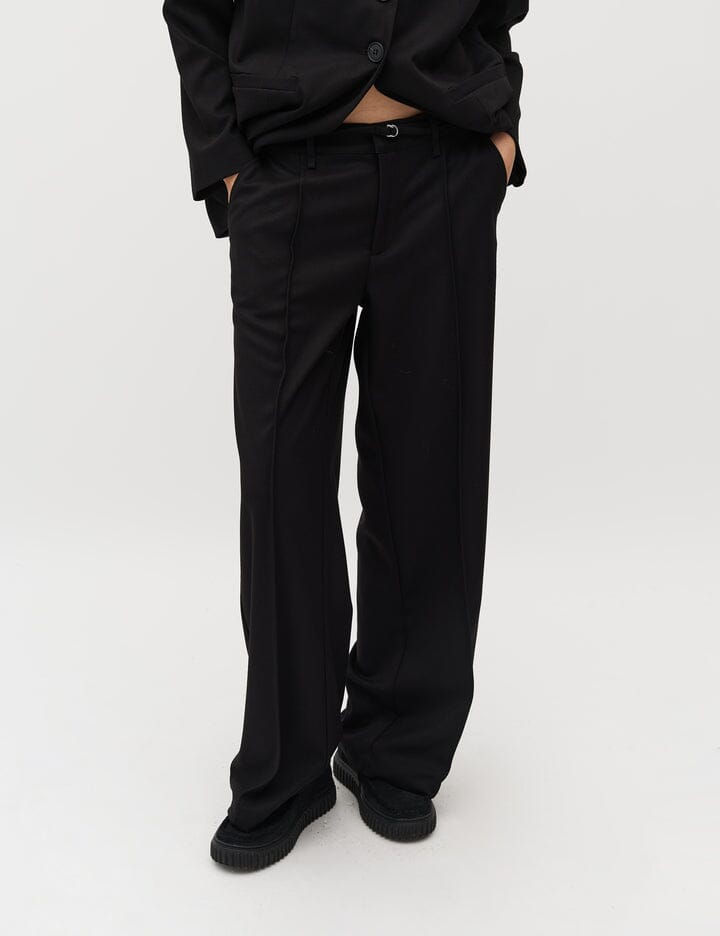 Bukser fra MbyM i svart med dekorative sømmer og beltedetaljer. Bukserne har en bred benåpning og gulvlengde, og de passer til både avslappede og formelle anledninger.