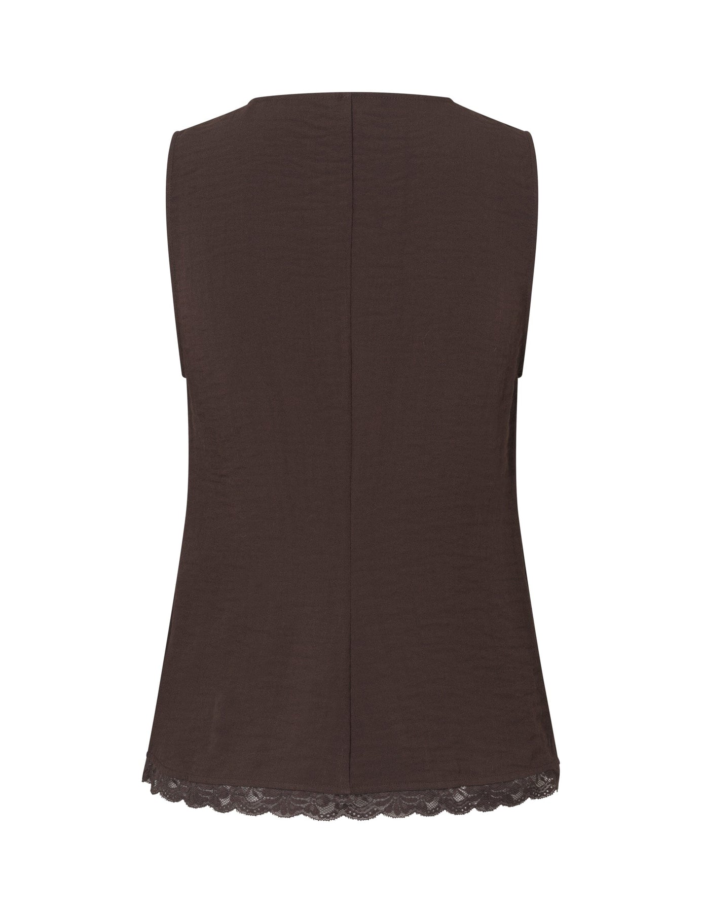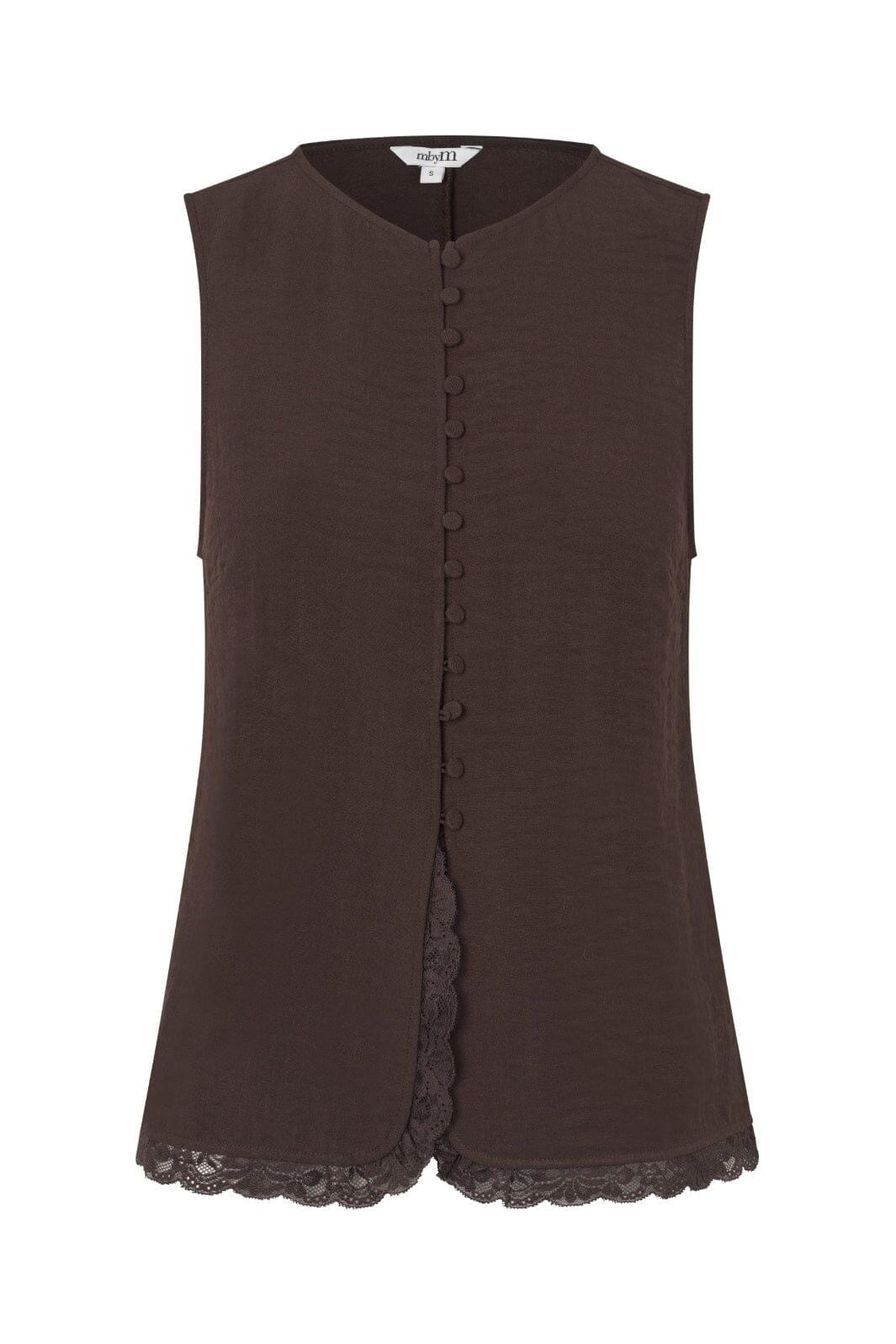 Ermeløs topp fra MbyM i mørkebrun farge. Toppen har rund halsutringning og knappelukking foran med stofftrukne knapper.