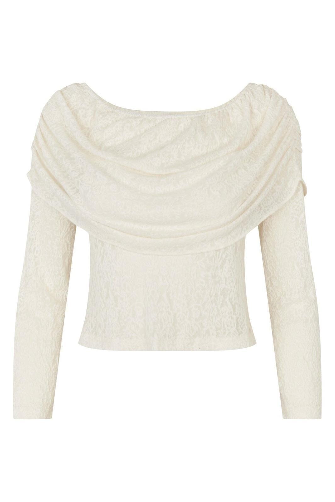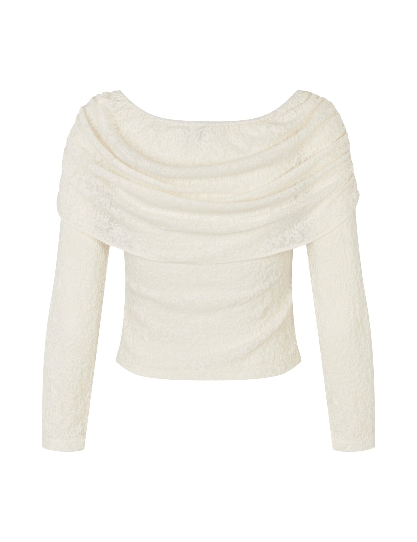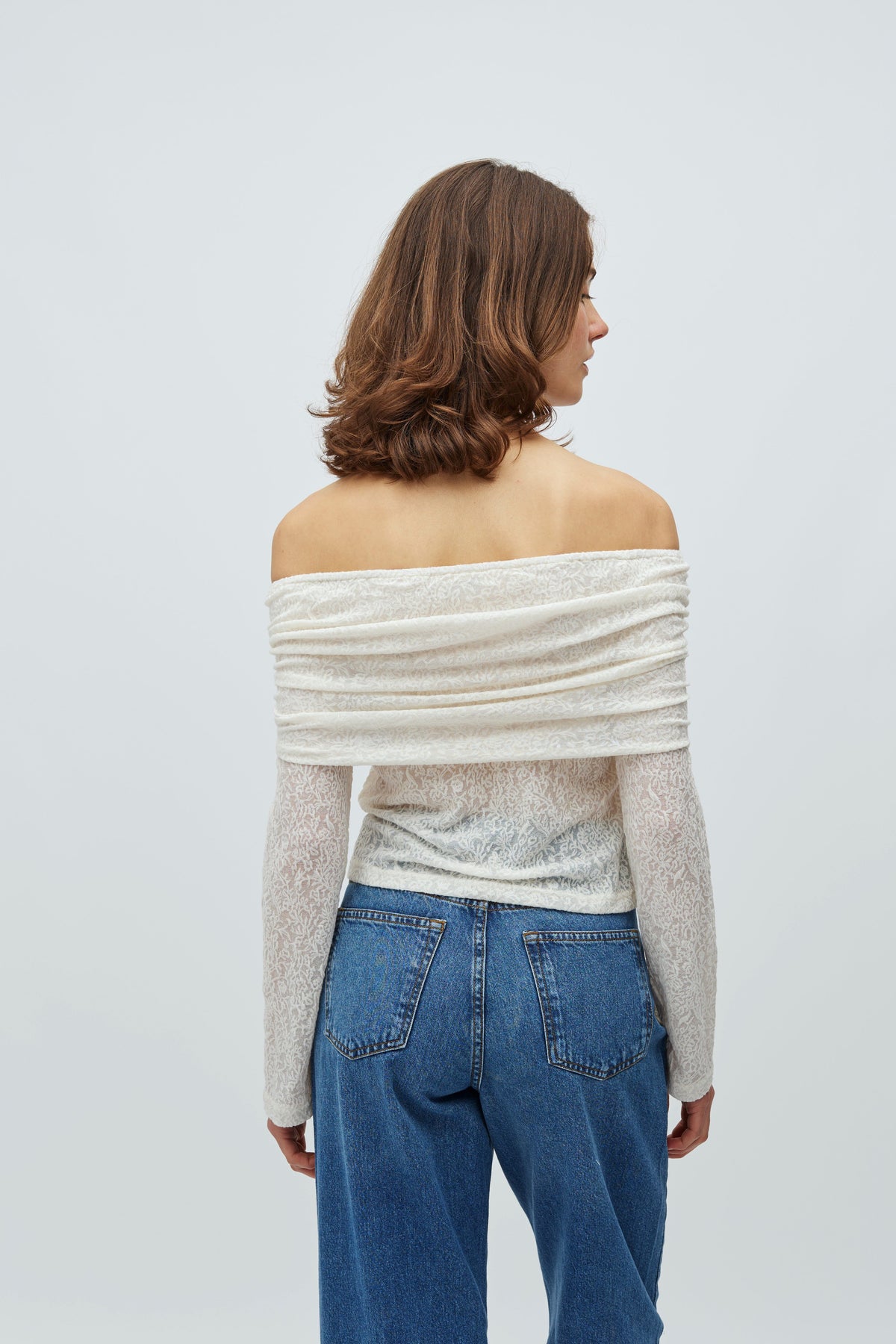 Bluse fra MbyM i kremfarge med off-shoulder utringning og blomstrete mønster. Blusen har blonde og volanger som gir den et feminint uttrykk.