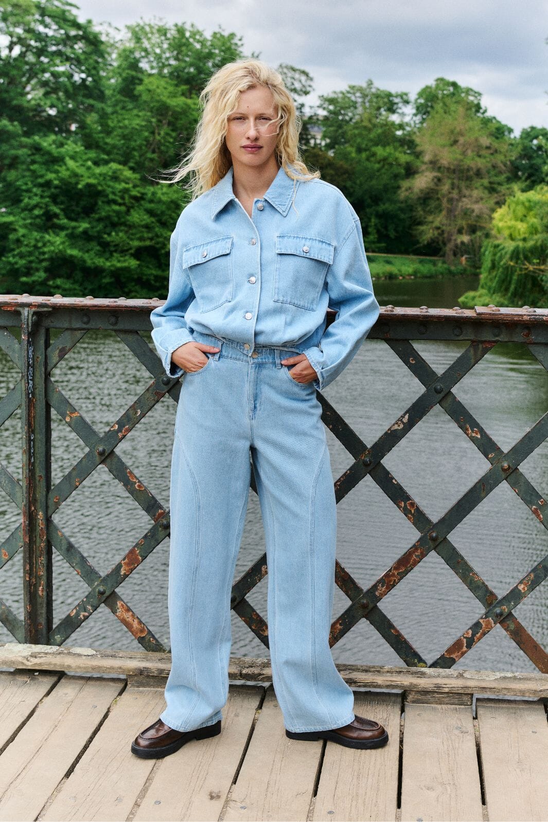 Jeans fra MbyM i lyseblå med en løs passform. Jeansene har høy midje og gulvlengde.