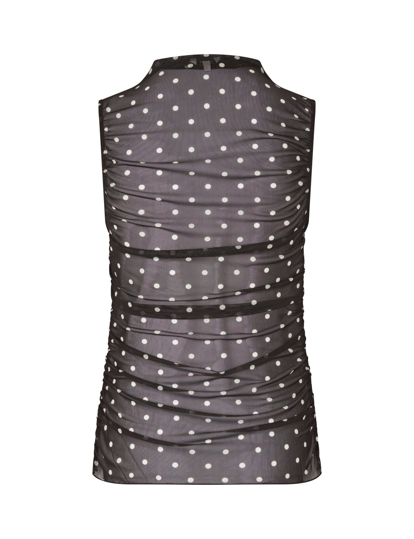 Ermeløs topp fra MbyM med prikkete mønster. Toppen er svart med hvite prikker og har rynkedetaljer langs sidene.