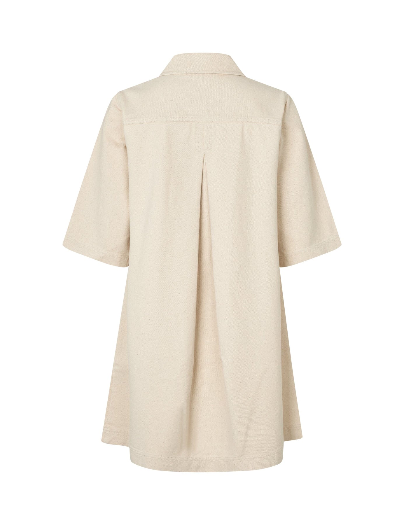 En beige skjortekjole fra MbyM, laget av 100 % bomull. Kjolen har skjortekrage, korte ermer og knappelukking hele veien ned foran.