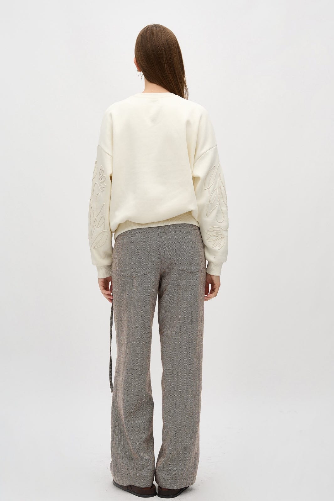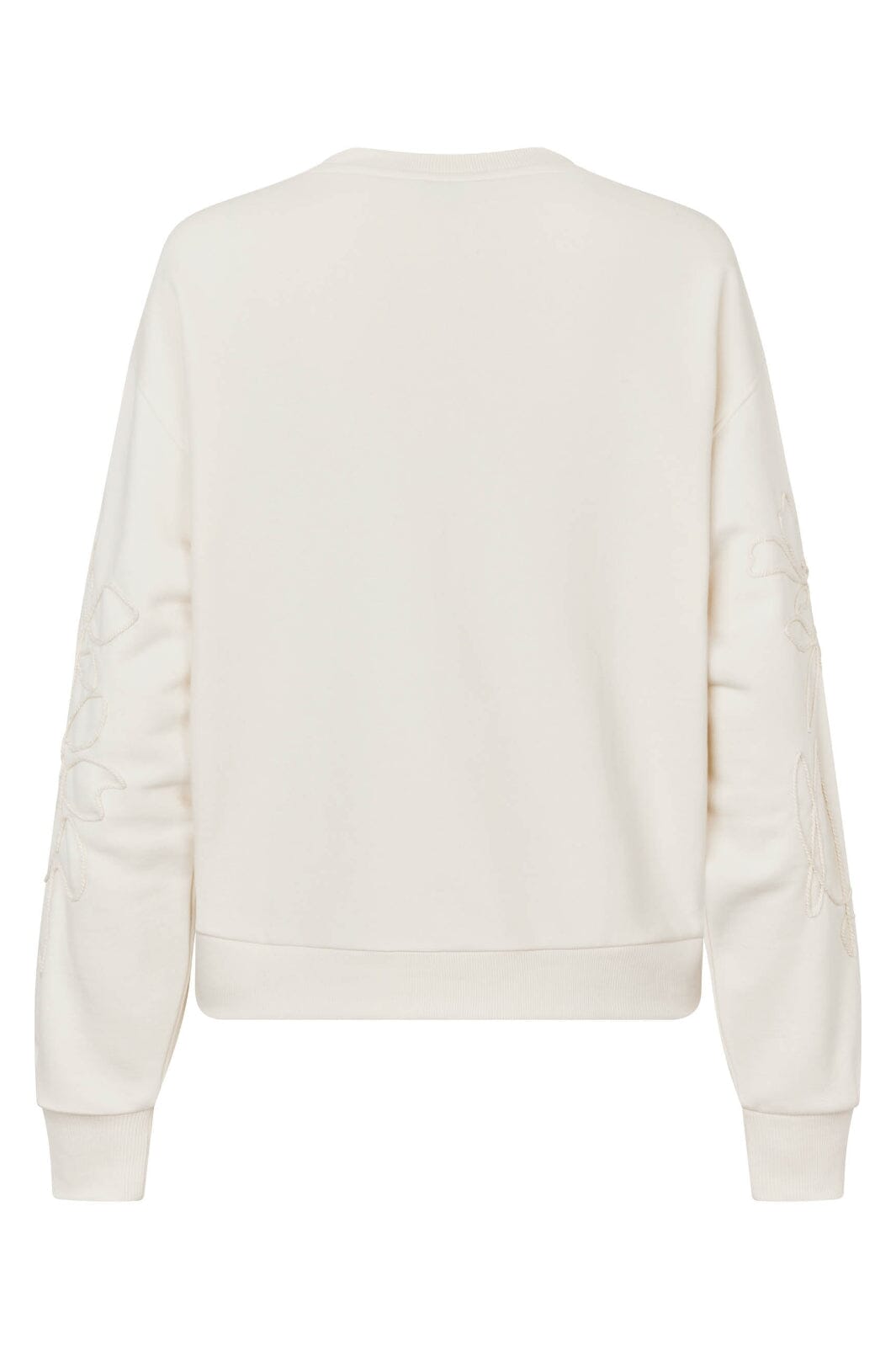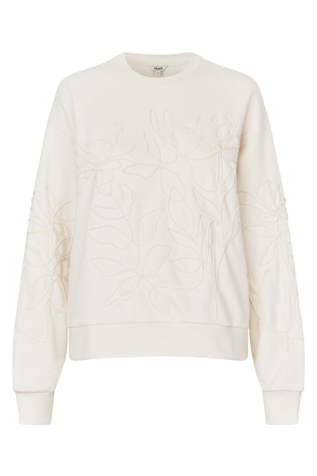 Kremfarget sweatshirt fra MbyM med blomsterbroderi på fronten og ermene. Den har rund halsutskjæring og lange ermer.