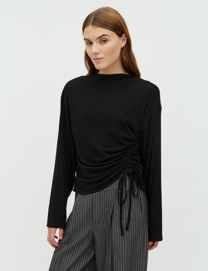 Sort topp fra MbyM med lange ermer og høy hals. Toppen har knytebånd i siden og volangdetaljer.