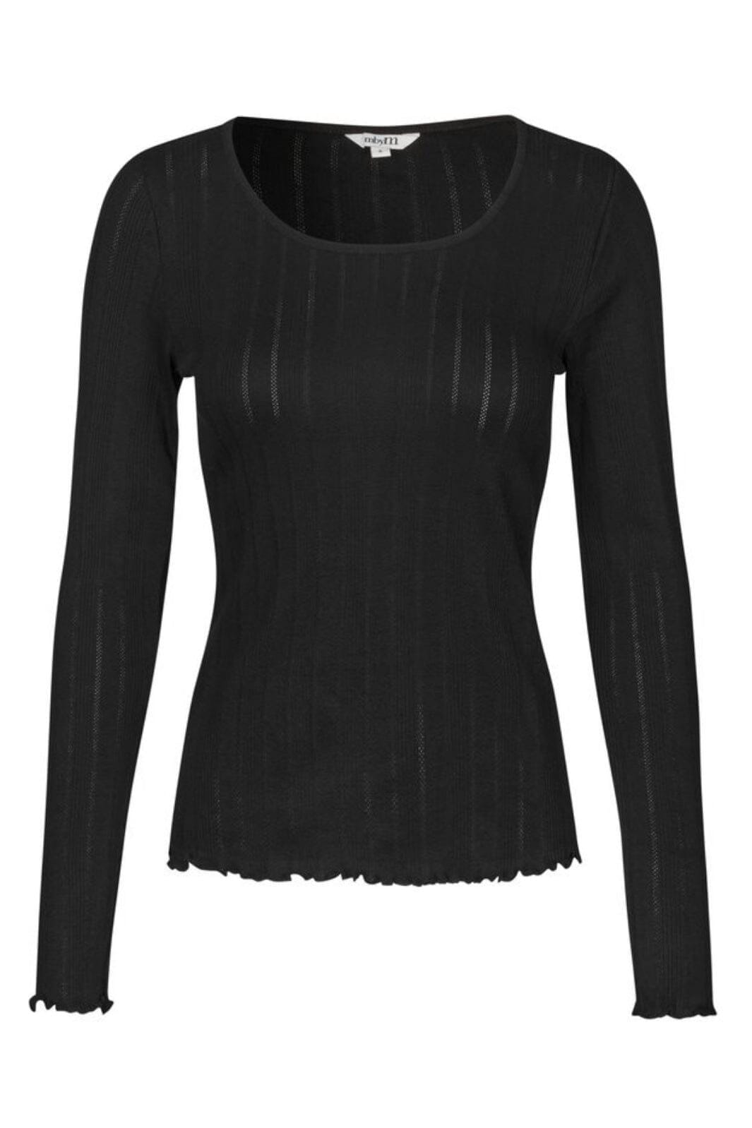Svart langermet topp fra MbyM med ribbet tekstur og volanger. Toppen har en rund halsutskjæring og tettsittende passform med vertikale striper i stoffet.