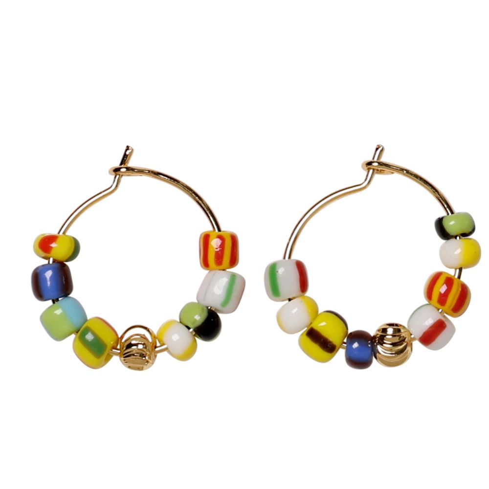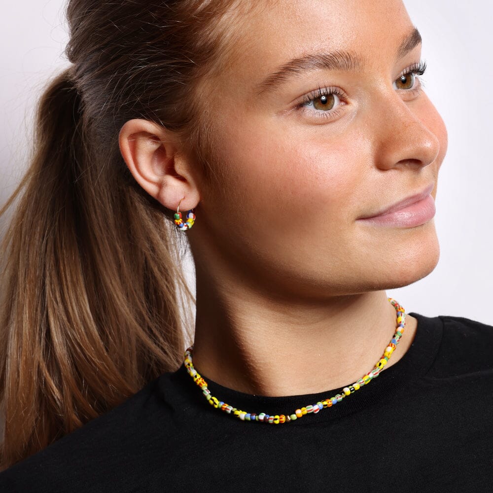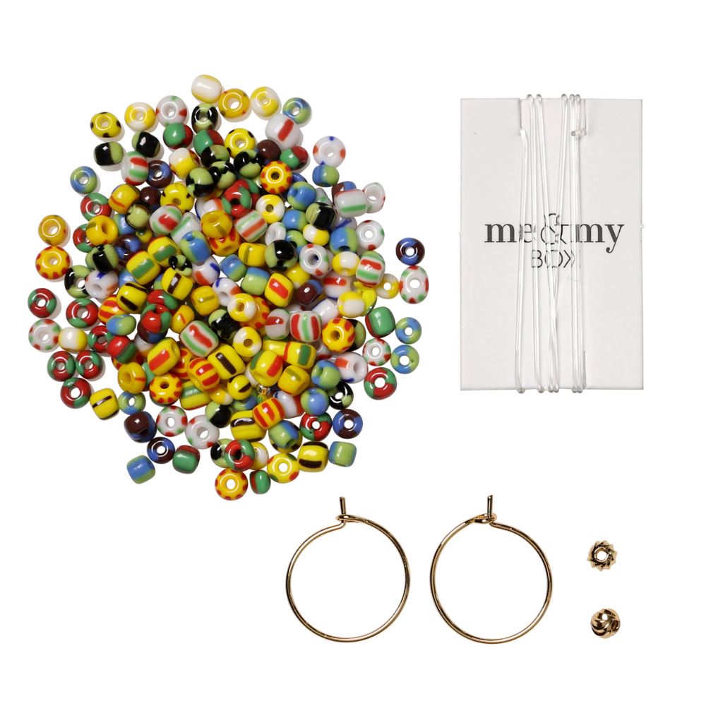 Grønn DIY smykkeboks fra Me & My Box med materialer til å lage et halskjede eller to armbånd. Boksen inneholder perler, steiner og smykkedeler samt et par hoops i forgylt messing.