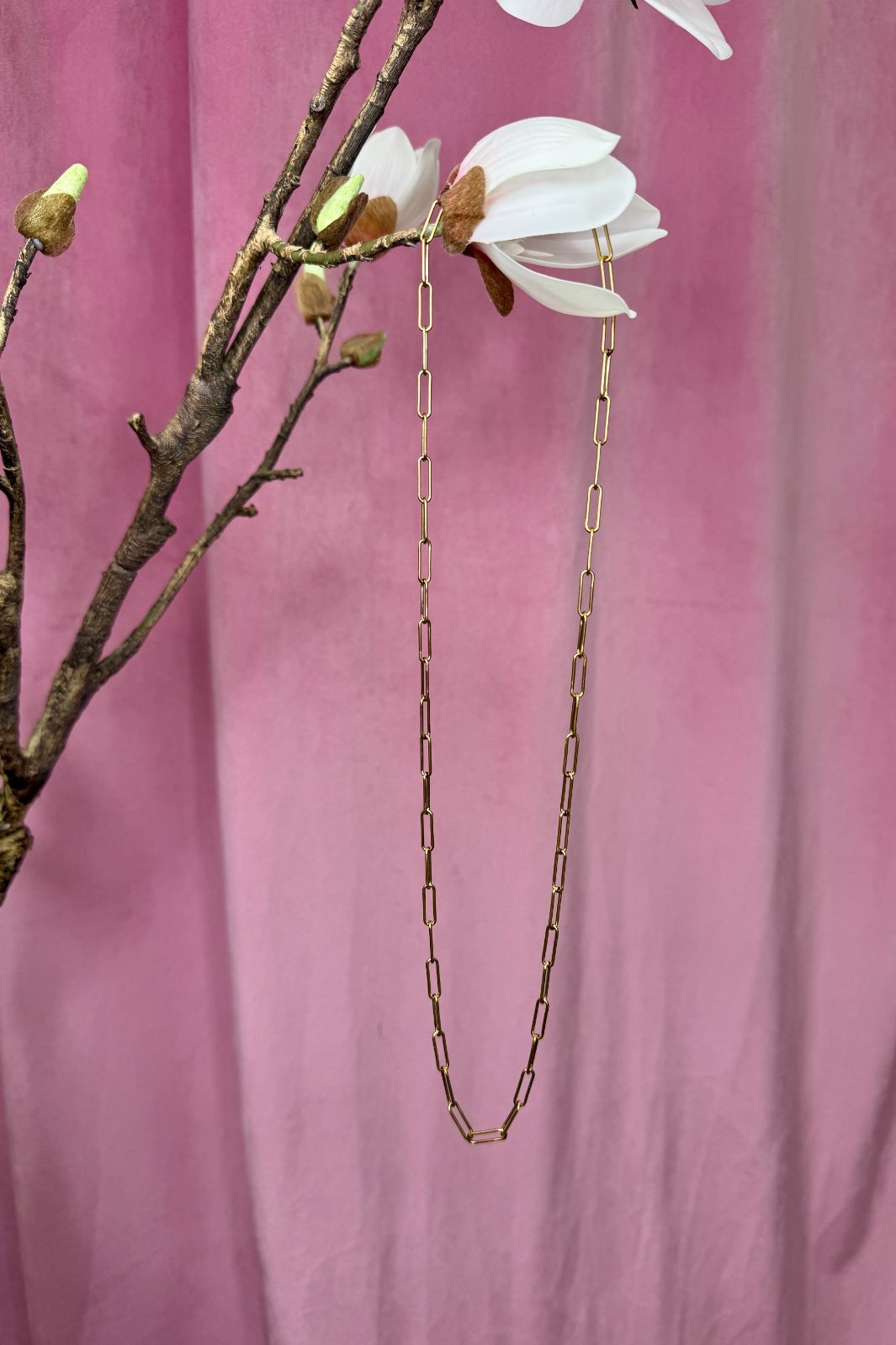 Forgylt halskjede fra Mellow Moon med et avlangt lenkedesign. Halskjede er laget av rustfritt stål med en varm, gullfarget overflate som passer til mange forskjellige antrekk.