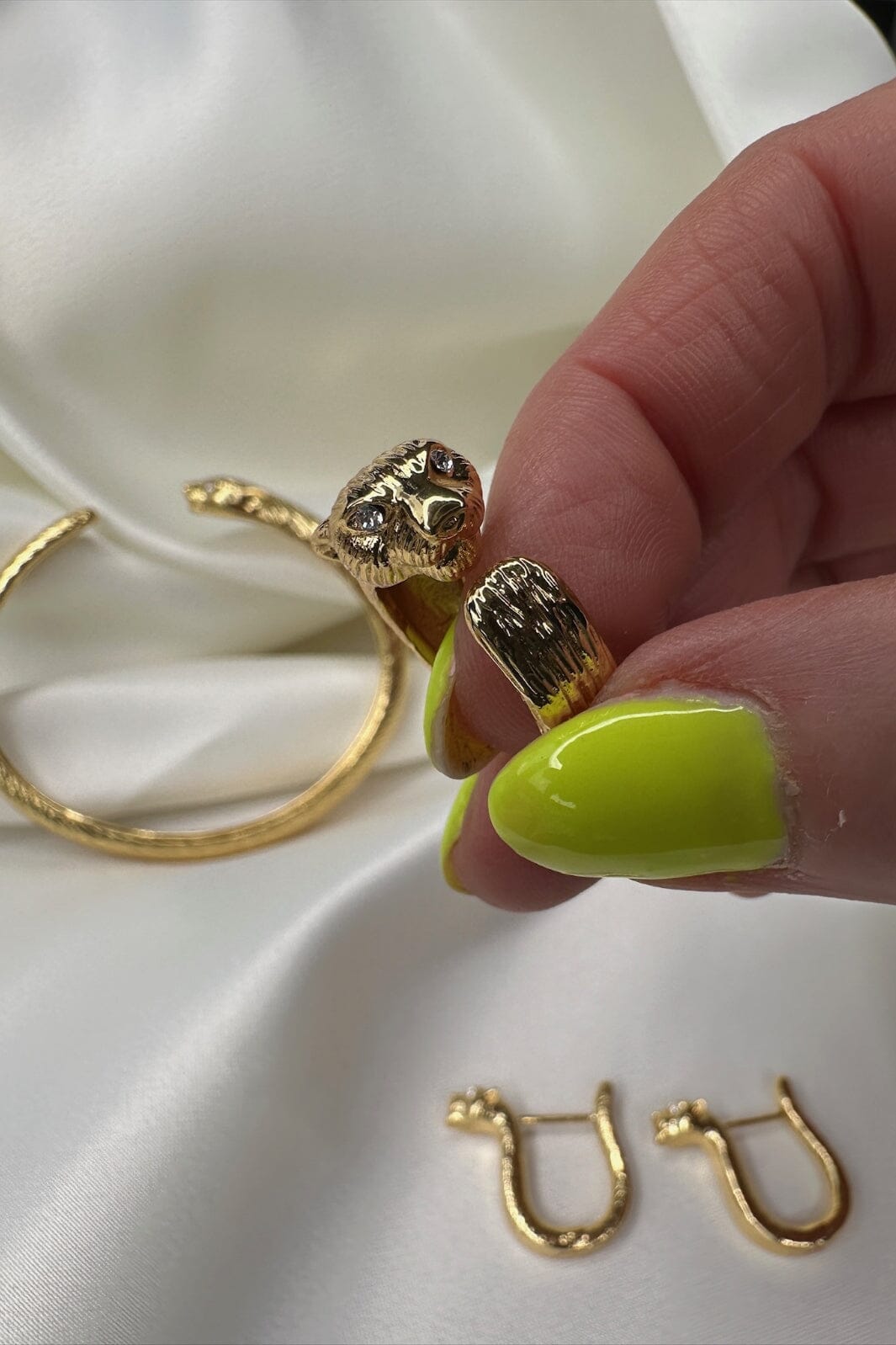 Forgylt ring fra Mellow Moon med et detaljert leopardhode. Ringen har en liten edelsten som øye og er utført i rustfritt stål med gylden finish.