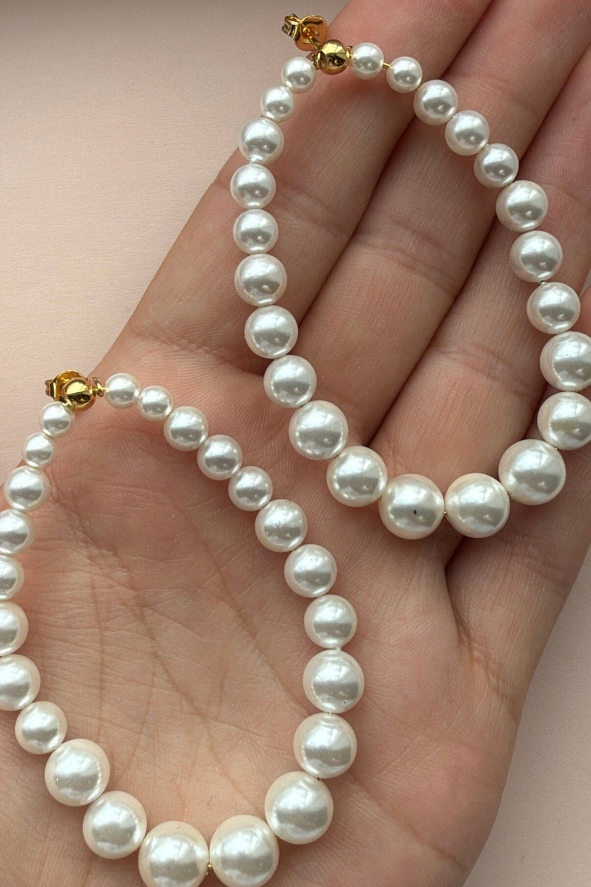 Store perleøredobber fra Mellow Moon med forgylte detaljer. Øredobbene har perler i forskjellige størrelser som er satt sammen i en dråpeform med en hvit og kremfargetone.