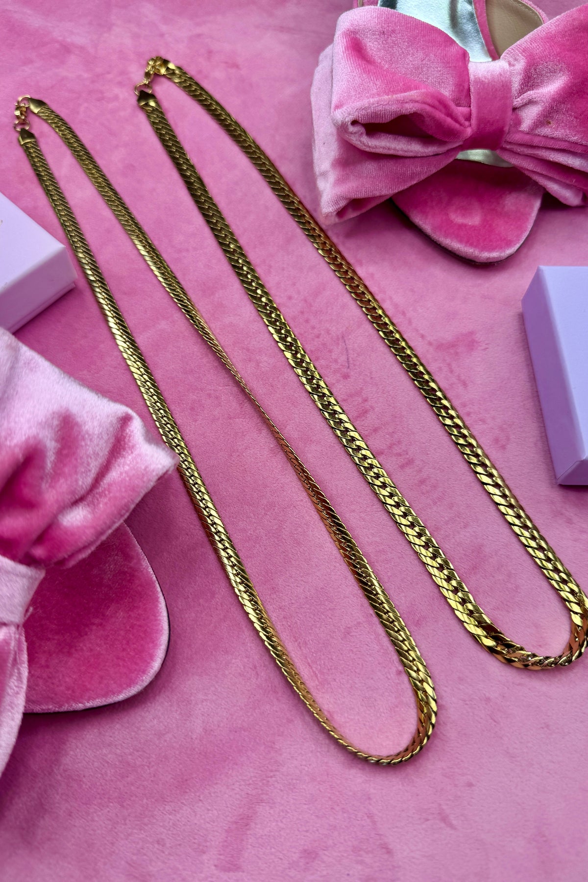 Forgylt halskjede fra Mellow Moon med snake chain-design. Den blanke overflaten reflekterer lyset, og kjeden har et slankt, snoet mønster gjennom hele lengden.