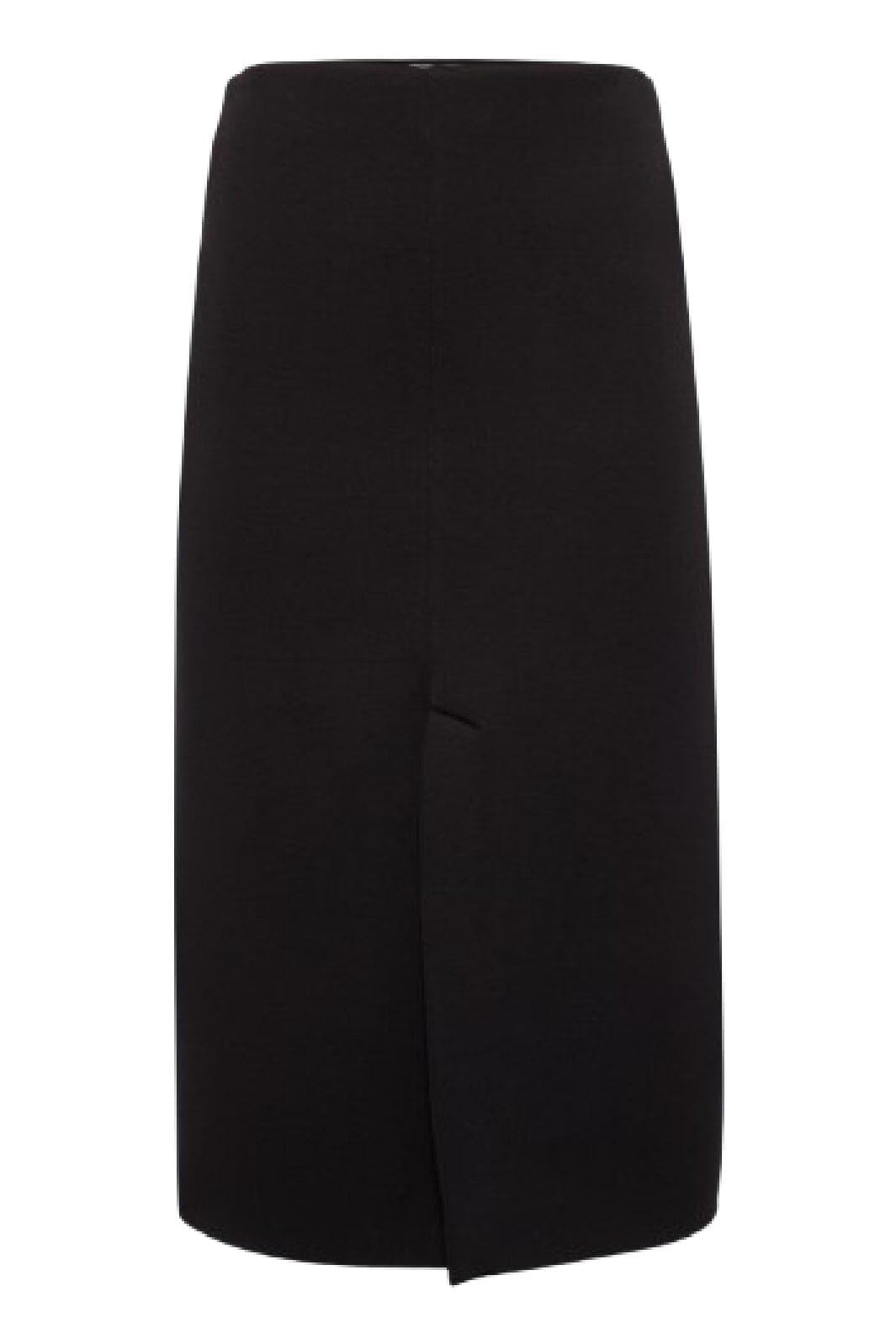 Svart skjørt fra Moves By Minimum i kne-lengde med rett silhuett og frontsplitt. Den enkle stilen passer både til kontoret og festlige anledninger.