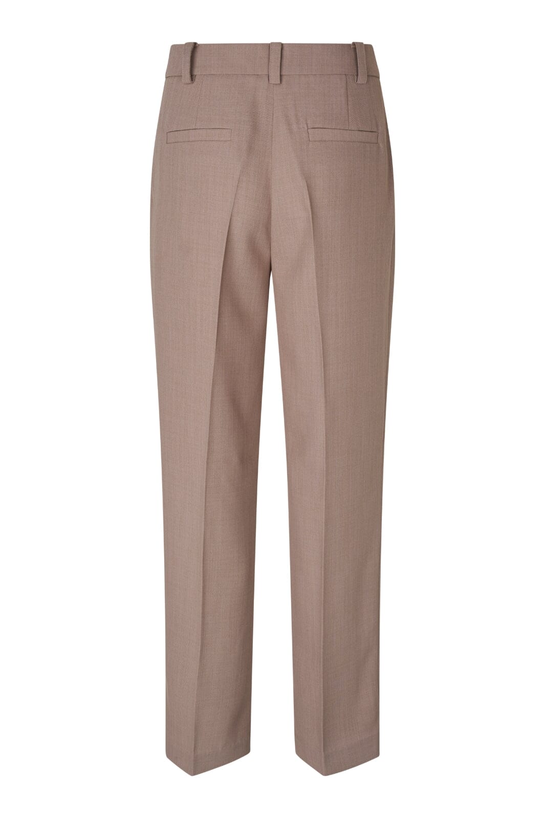 Beige bukser fra Modström med ankellengde og rette, vide ben. Buksene har pressefolder foran og en løs passform med knapp- og glidelåslukking i livet.