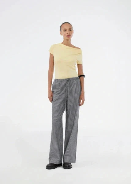 Gul T-skjorte fra Modström med en drapert halsutringning. T-skjorten har korte ermer og en tettsittende passform.