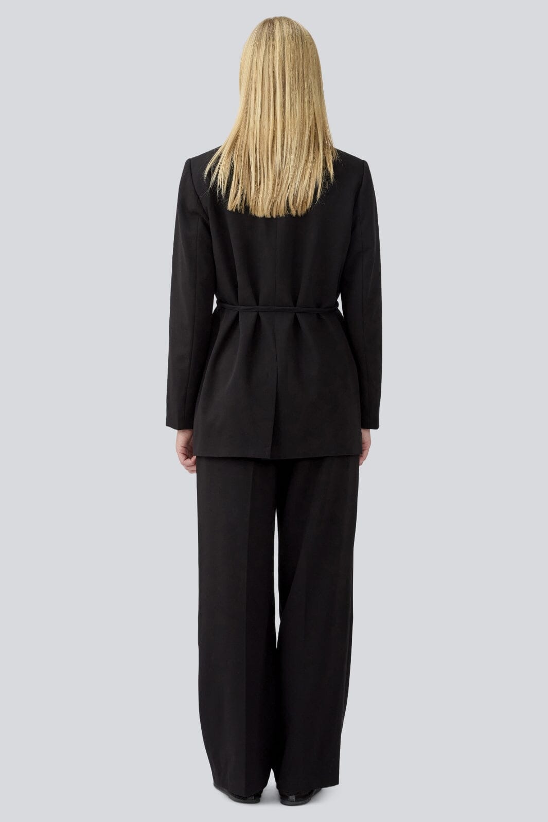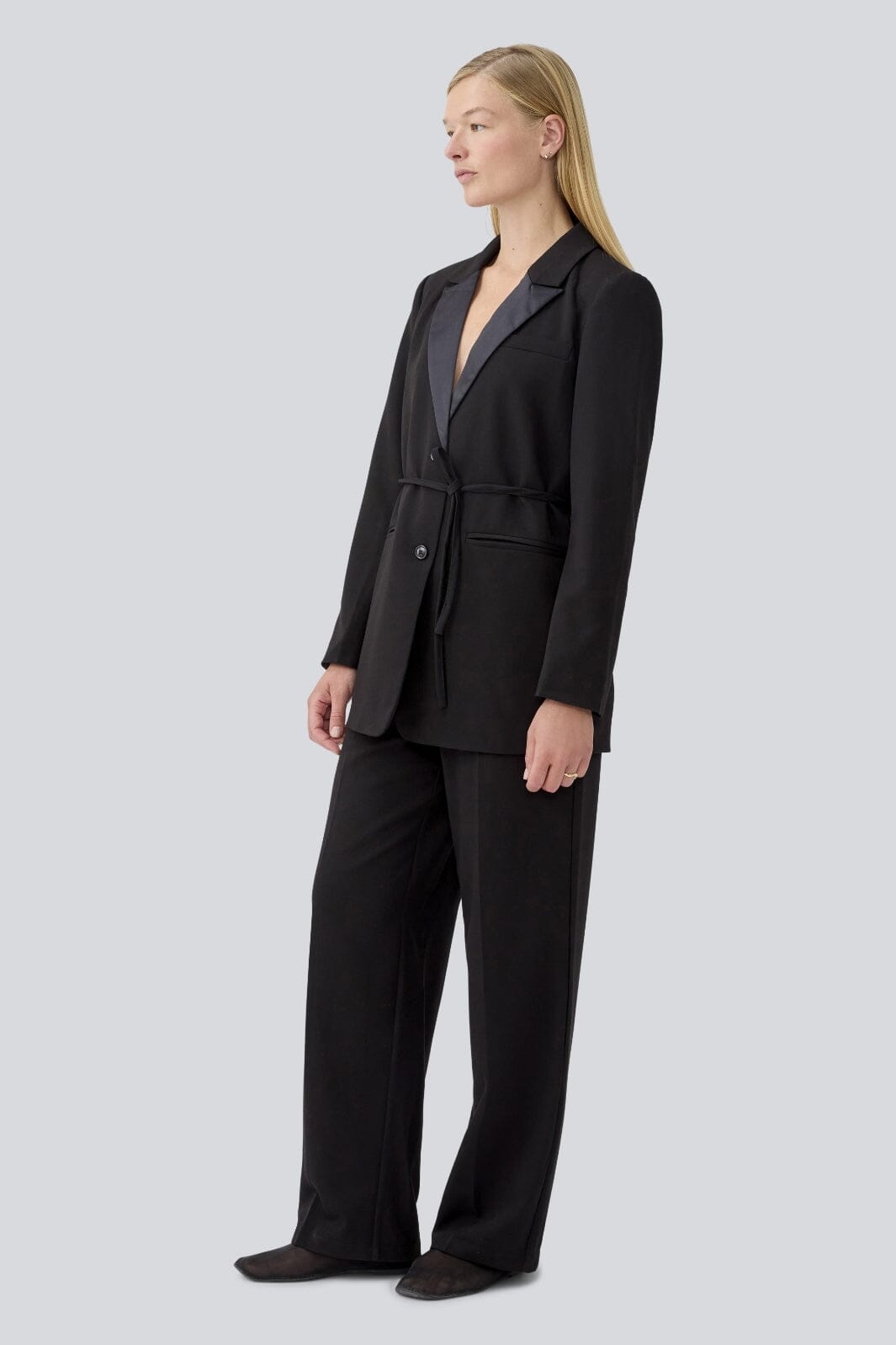 Svart blazer med oversize-passform fra Modström. Blazeren har satindetaljer på kragen og et bindebånd i midjen som gir mulighet for å tilpasse passformen.