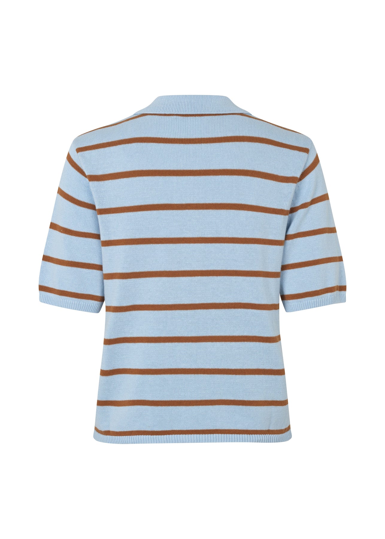 Stribet poloskjorte fra Modström, laget av 100 % bomull. Poloskjorten har lyseblå og brune horisontale striper med en klassisk polokrage.