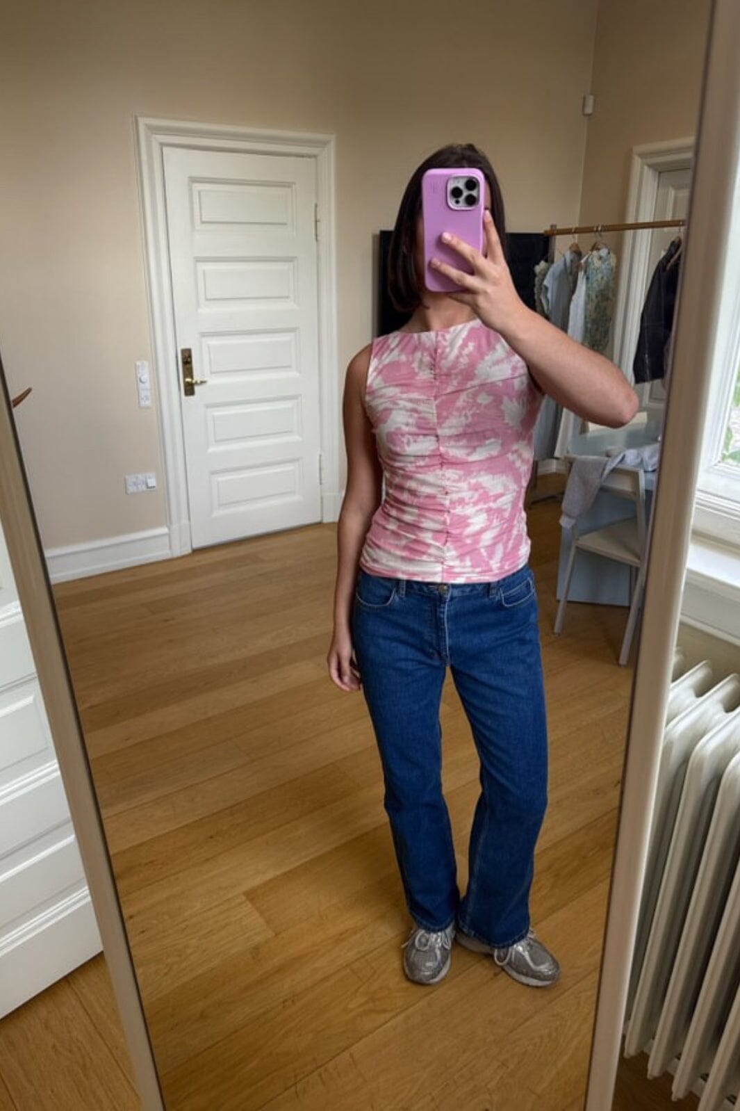 Ermeløs topp fra Modström med rosa og kremfarget tie-dye mønster. Toppen har rynkedetaljer foran og en rund halsutskjæring.