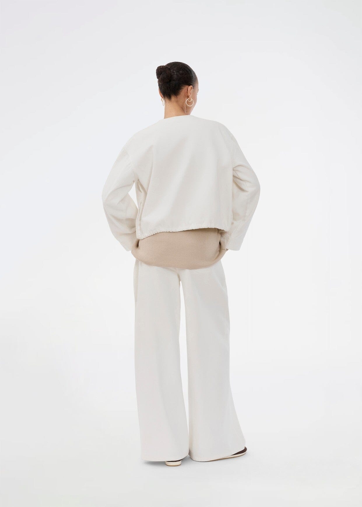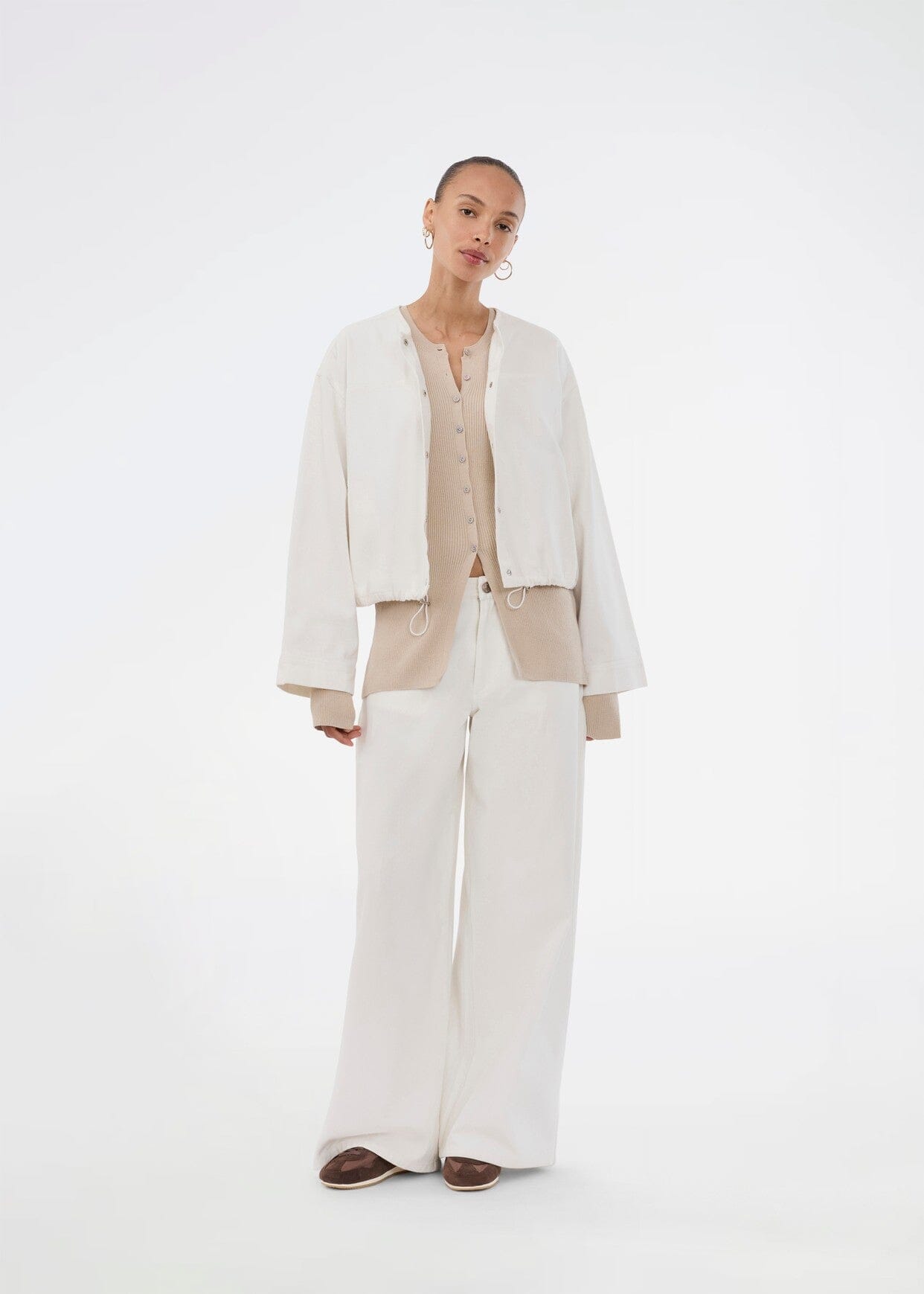 Vide bukser fra Modström i en lys kremfarge. Buksene er laget av 100 % bomull og har en høy midje med strikk.