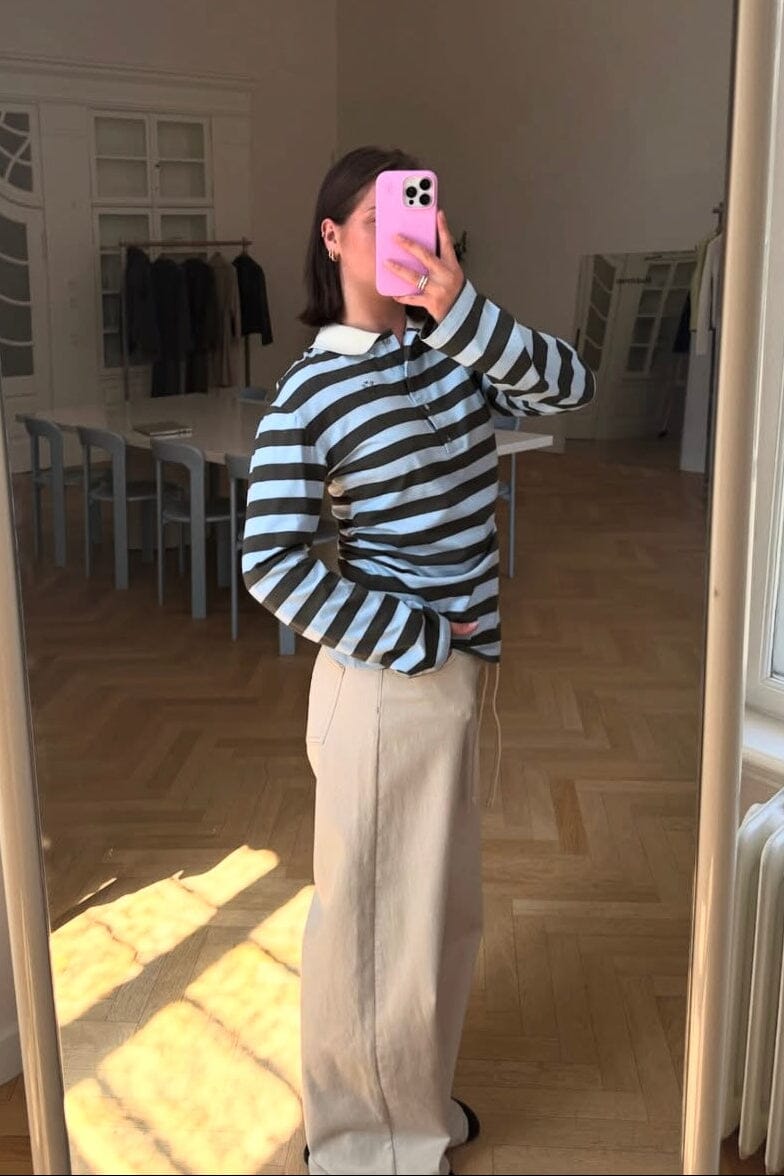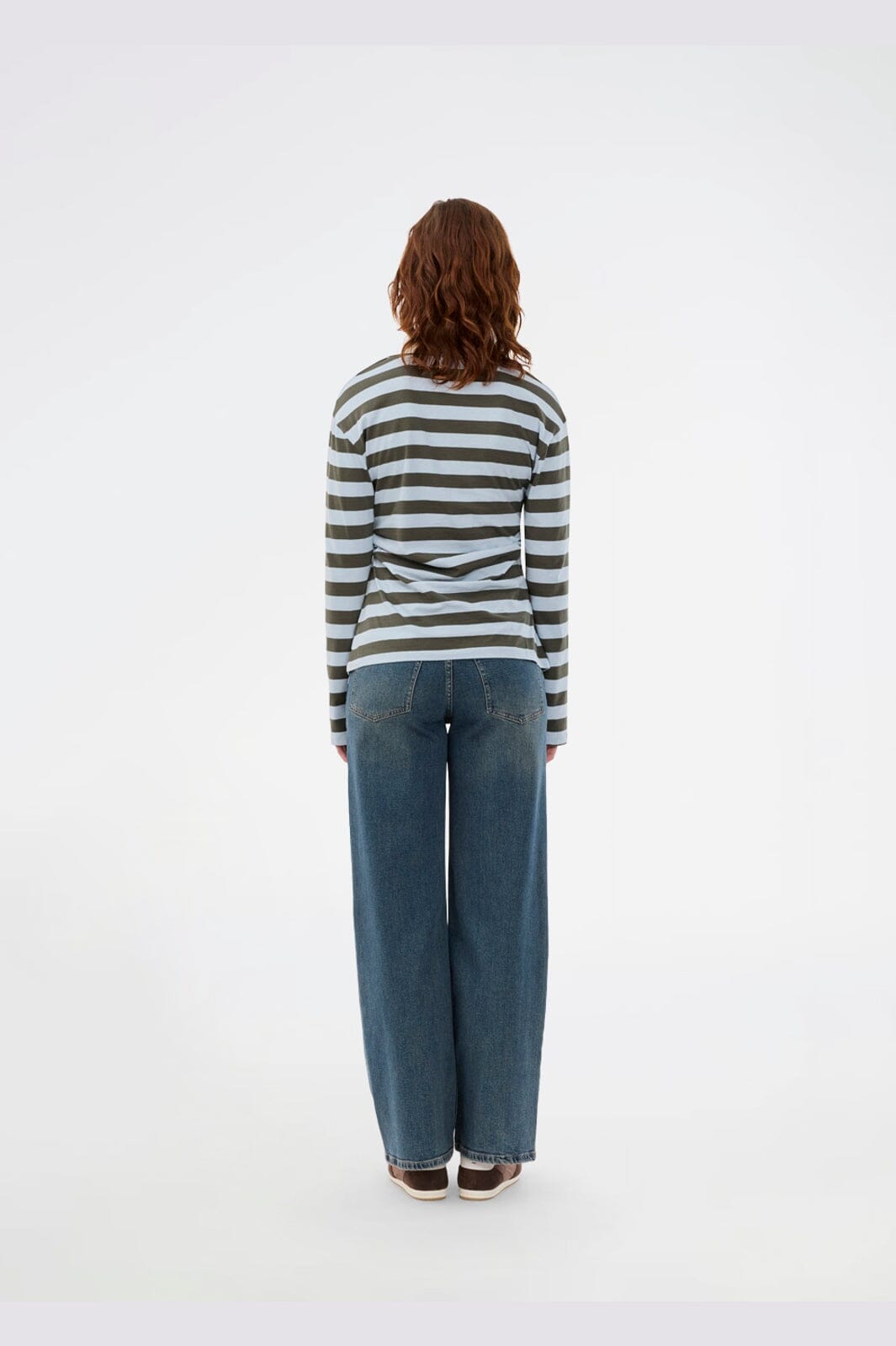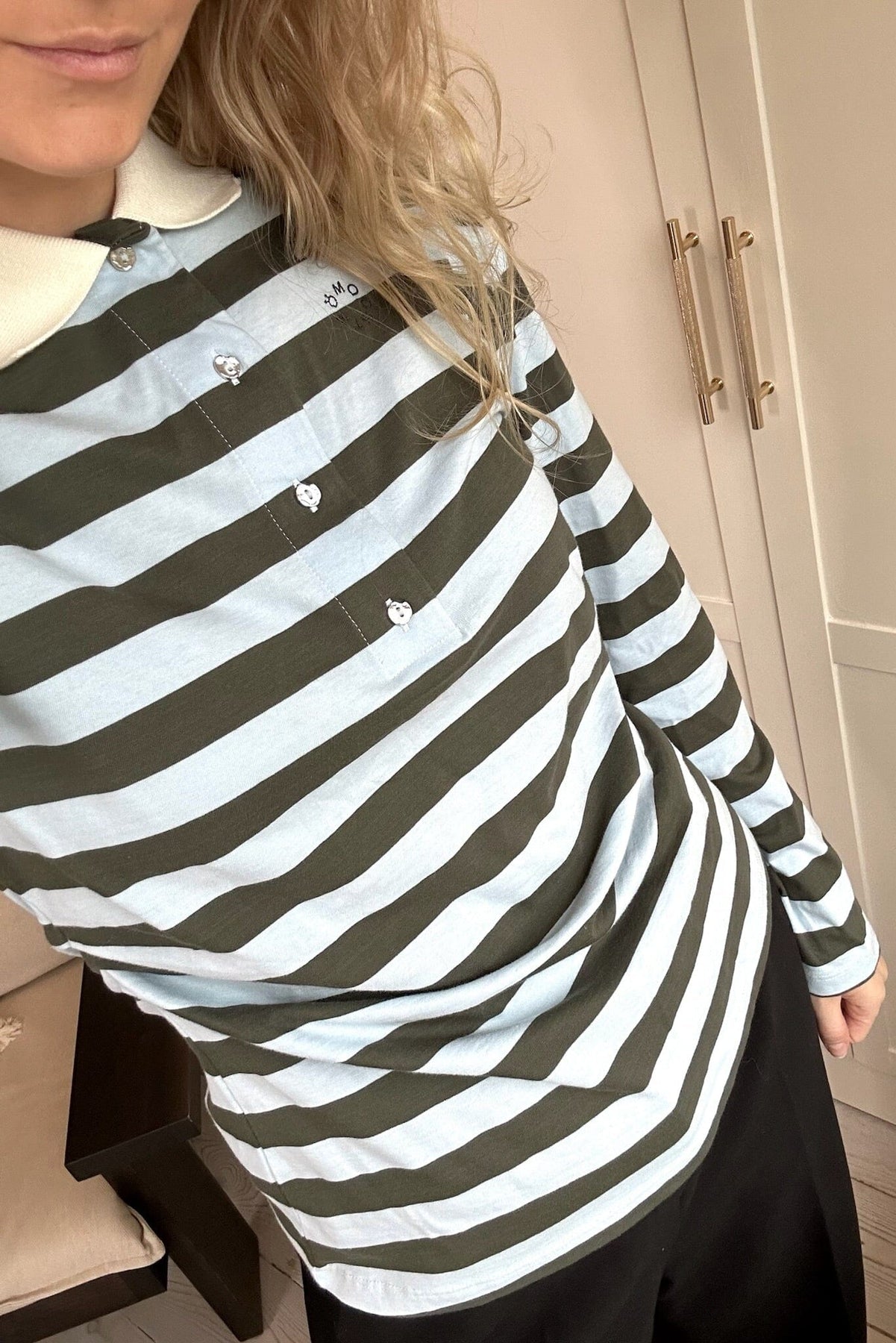 Langermet polo fra Modström i økologisk bomull. Designet med horisontale striper i lyseblå og mørkegrønne nyanser samt en hvit polokrage med knappelukking.