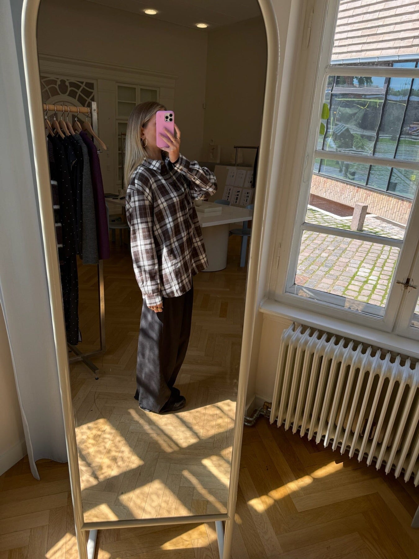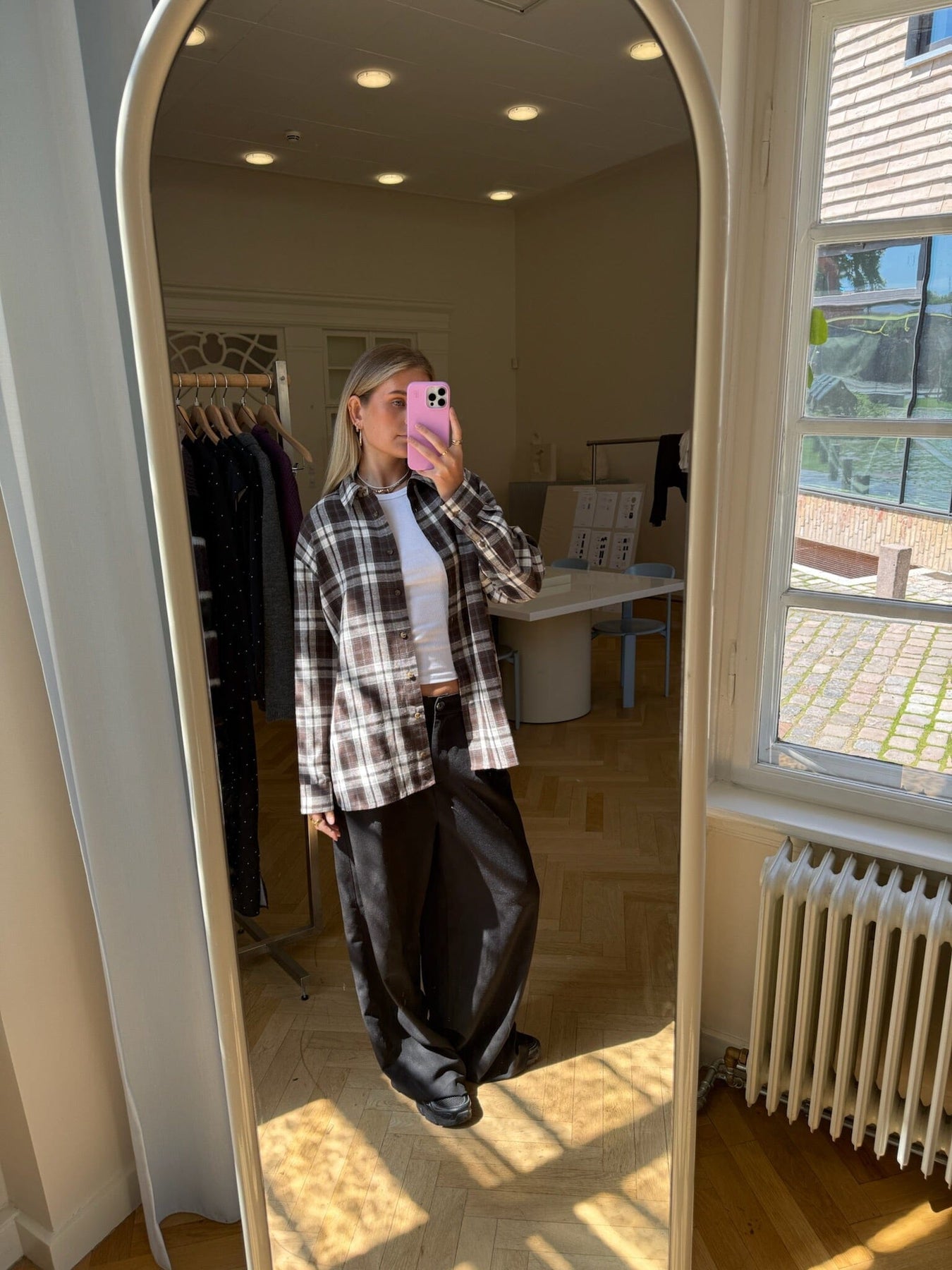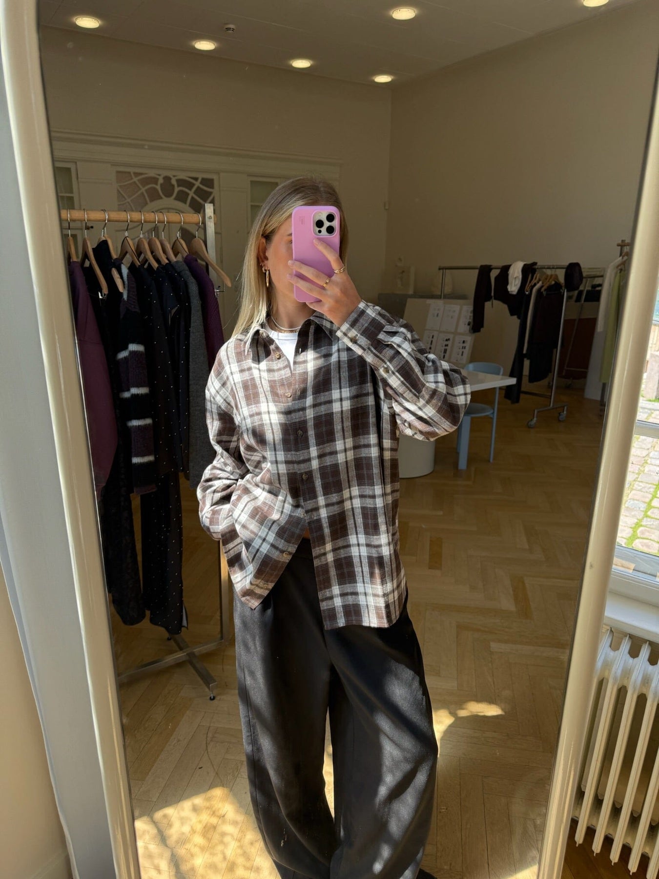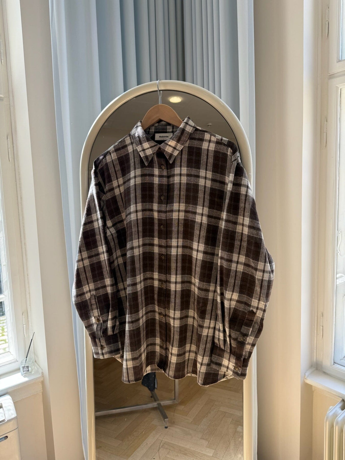Rutete skjorte fra Modström i brunt og hvitt. Det rutete mønsteret gir skjorten et klassisk uttrykk med en avslappet stil.