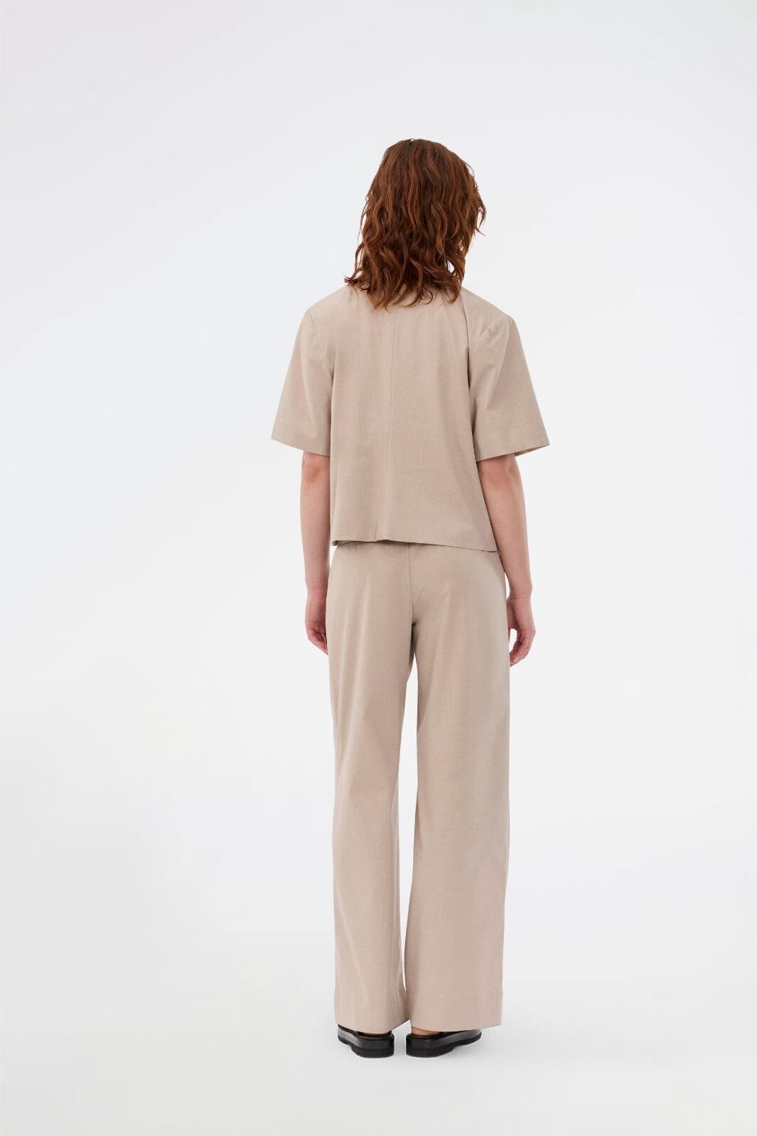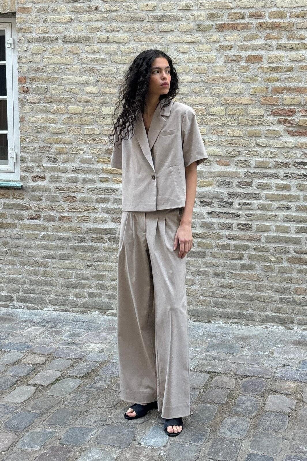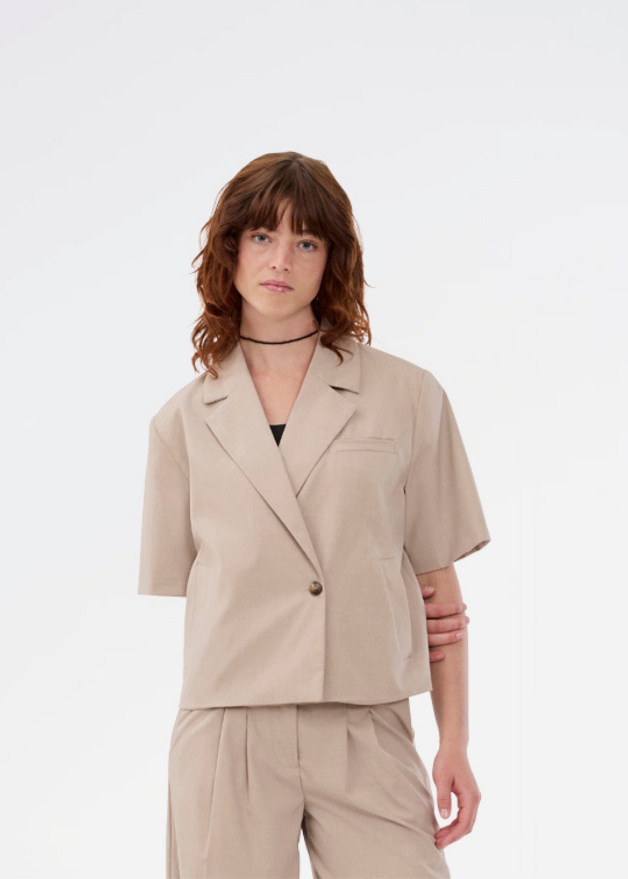 Kortermet blazer fra Modström i beige med melert struktur. Blazeren har skjortekrage, knappelukking og en løs passform.