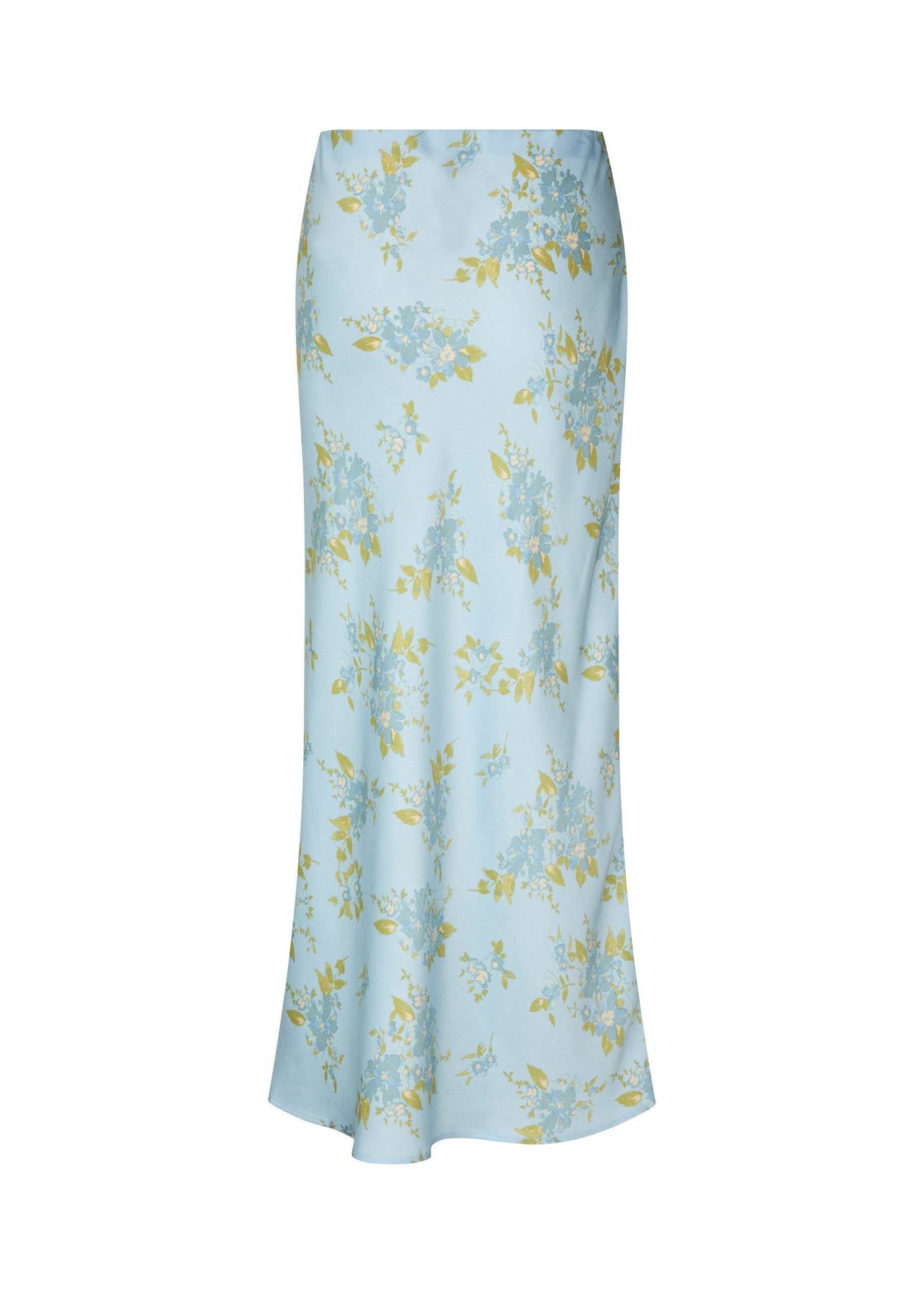 Lang skjørt fra Modström med romantisk blomsterprint i gule og blå nyanser på en lyseblå bunn. Skjørtet passer både til fest og hverdag.