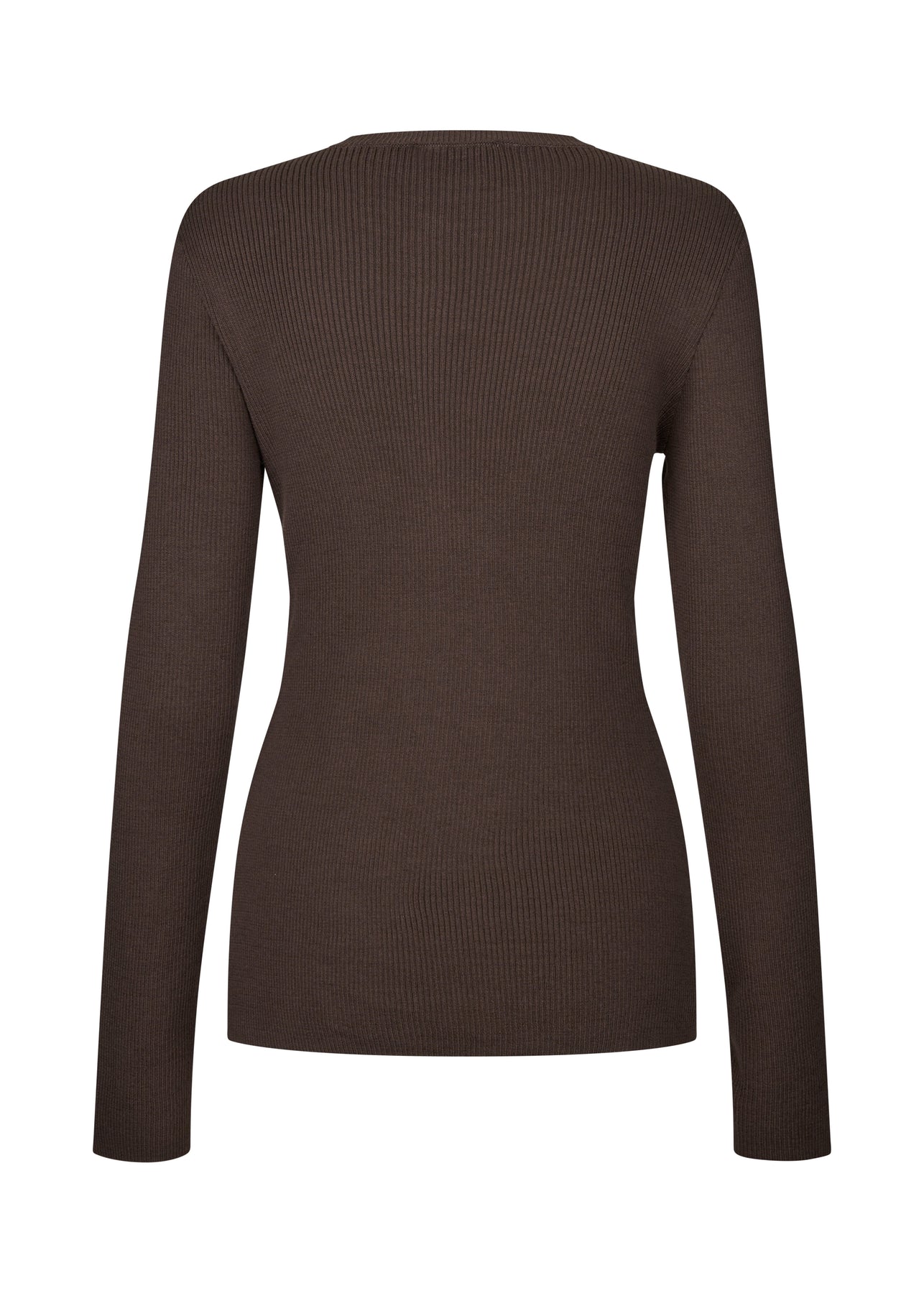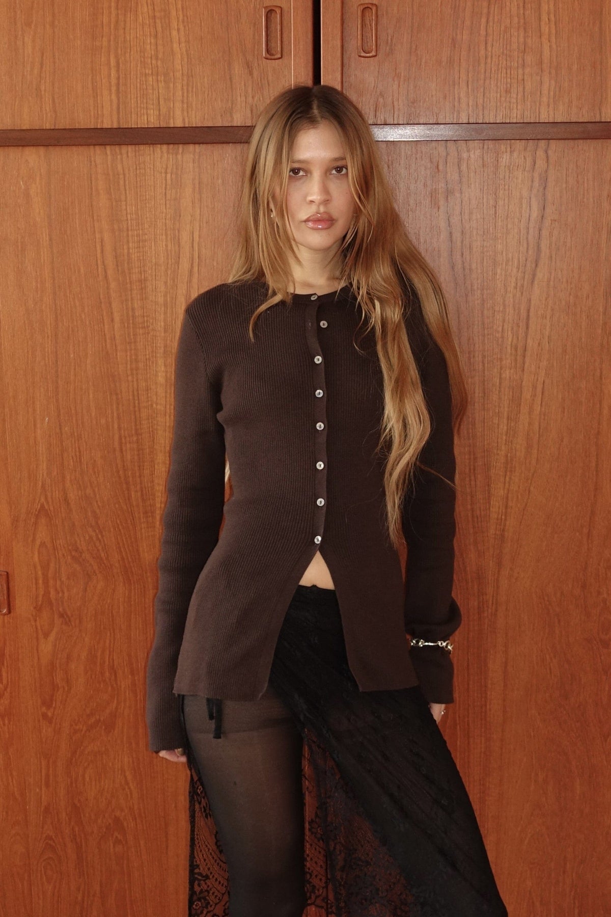 Brun cardigan fra Modström med ribbestrikket tekstur og en tettsittende passform. Cardiganen har lange ermer og knepping foran.