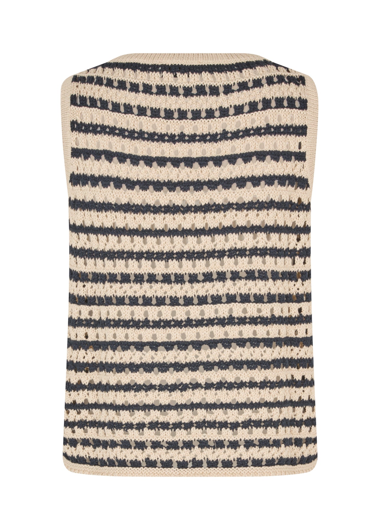 Stripet strikket topp fra Modström i mørkeblått og sandfarger. Den ermeløse toppen har et hullmønster og er laget av 100 % økologisk bomull.