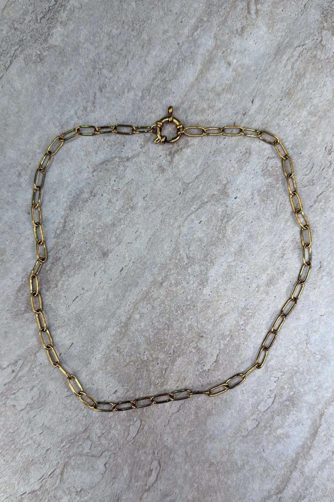 Halskjede fra Molly&My Jewellery, laget av rustfritt stål med en gullfarget finish. Kjedet har avlange ledd og en rund lås.