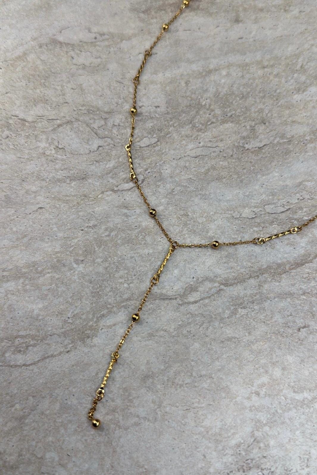 Forgylt halskjede fra Molly&My Jewellery, laget av rustfritt stål med små runde perler langs kjedet og en Y-formet anhengsdel.