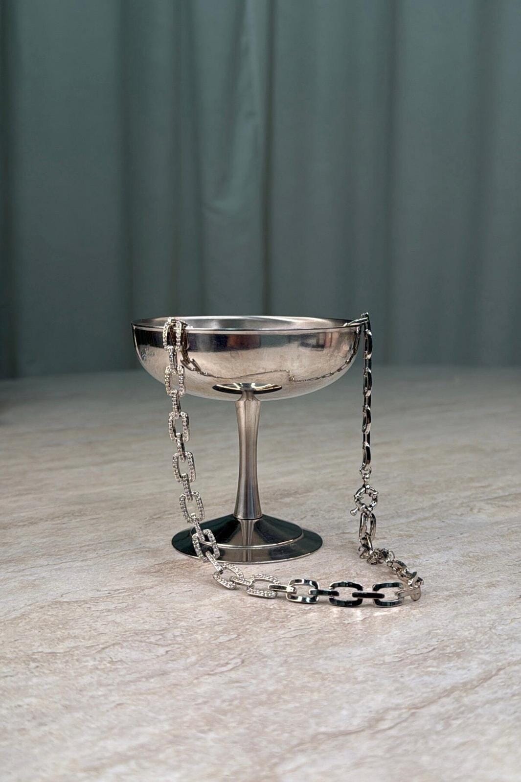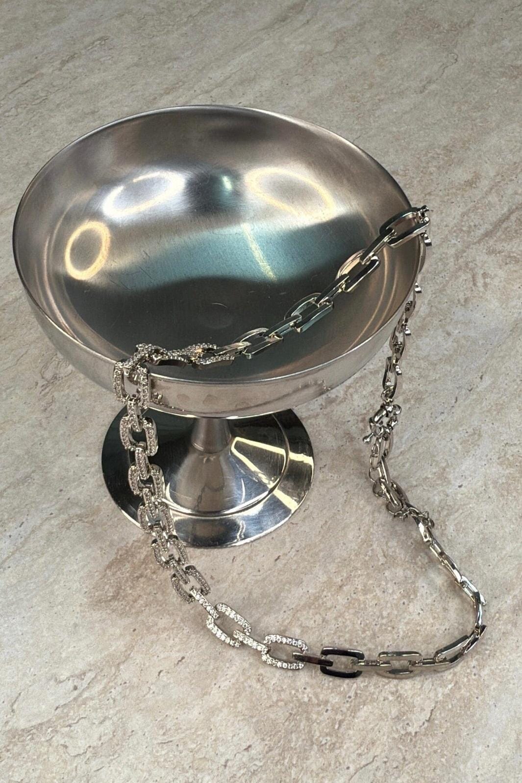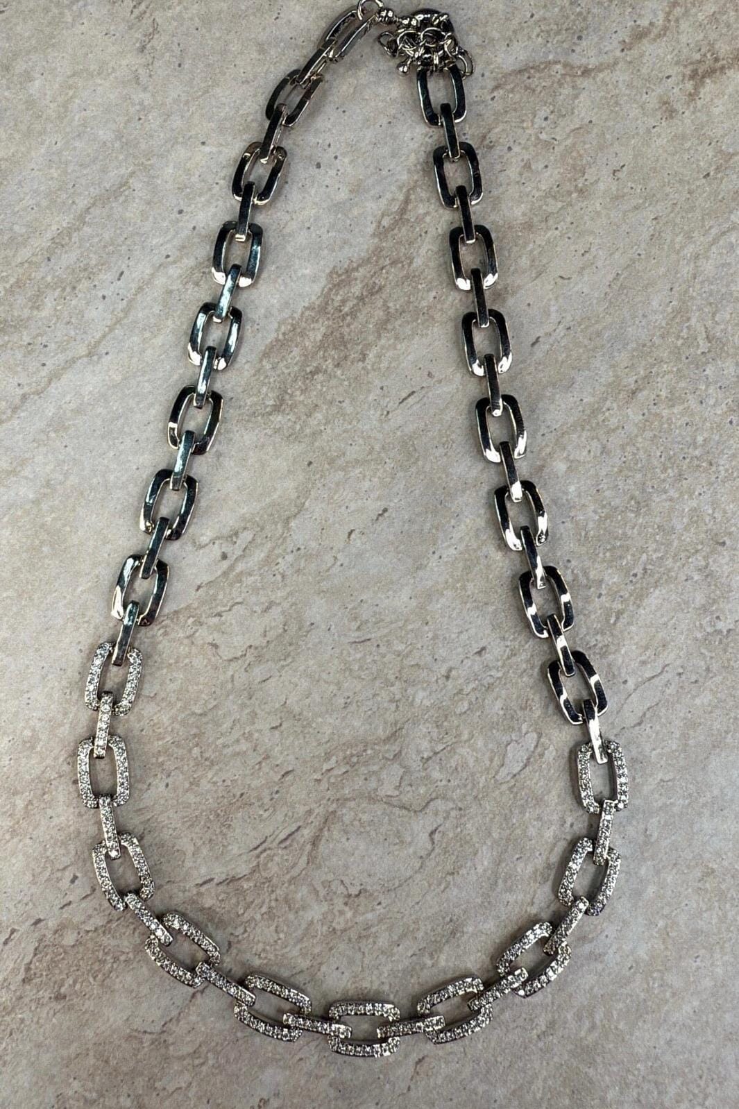 Forsølvet halskjede fra Molly&My Jewellery med store, rektangulære ledd. Noen ledd er glatte, mens andre er dekorert med små steiner.
