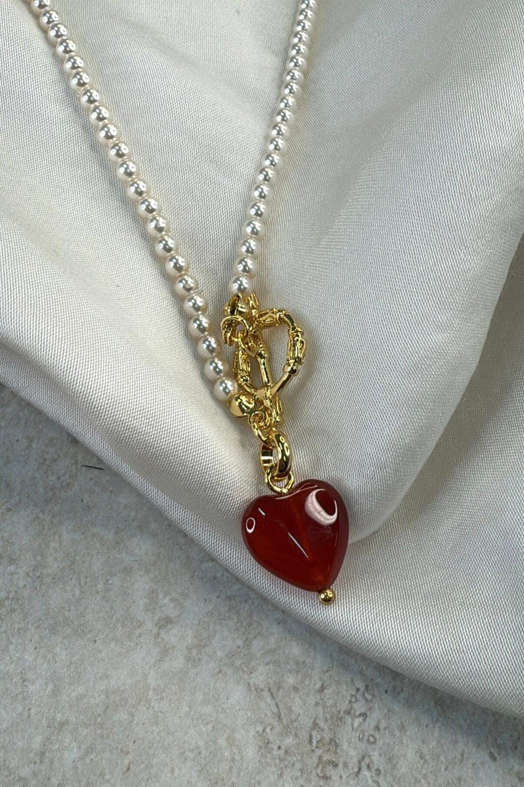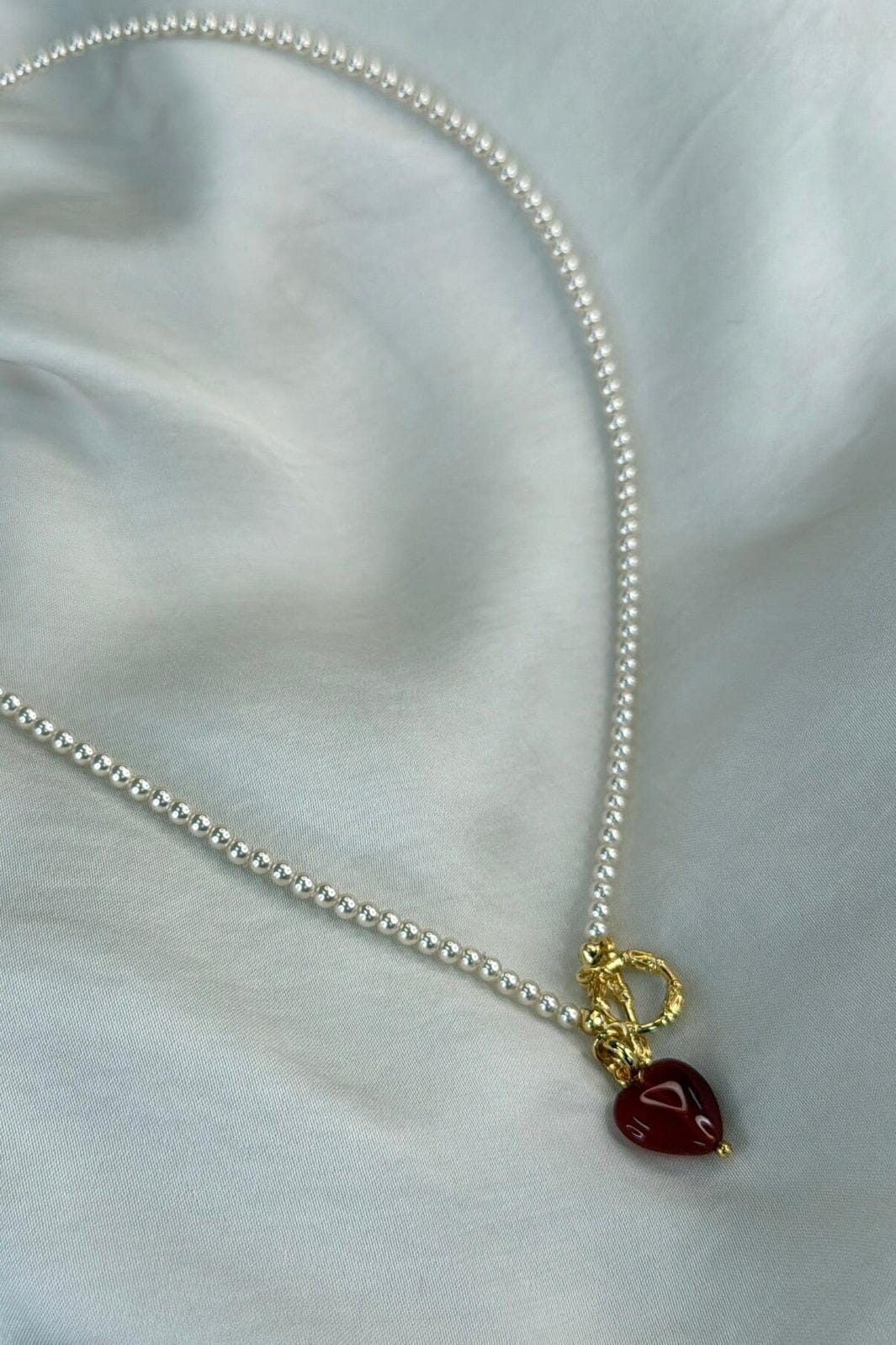 Forgylt halskjede fra Molly&My Jewellery med små perlelignende kuler, et rødt hjerteformet anheng og en gullfarget toggle-lås.