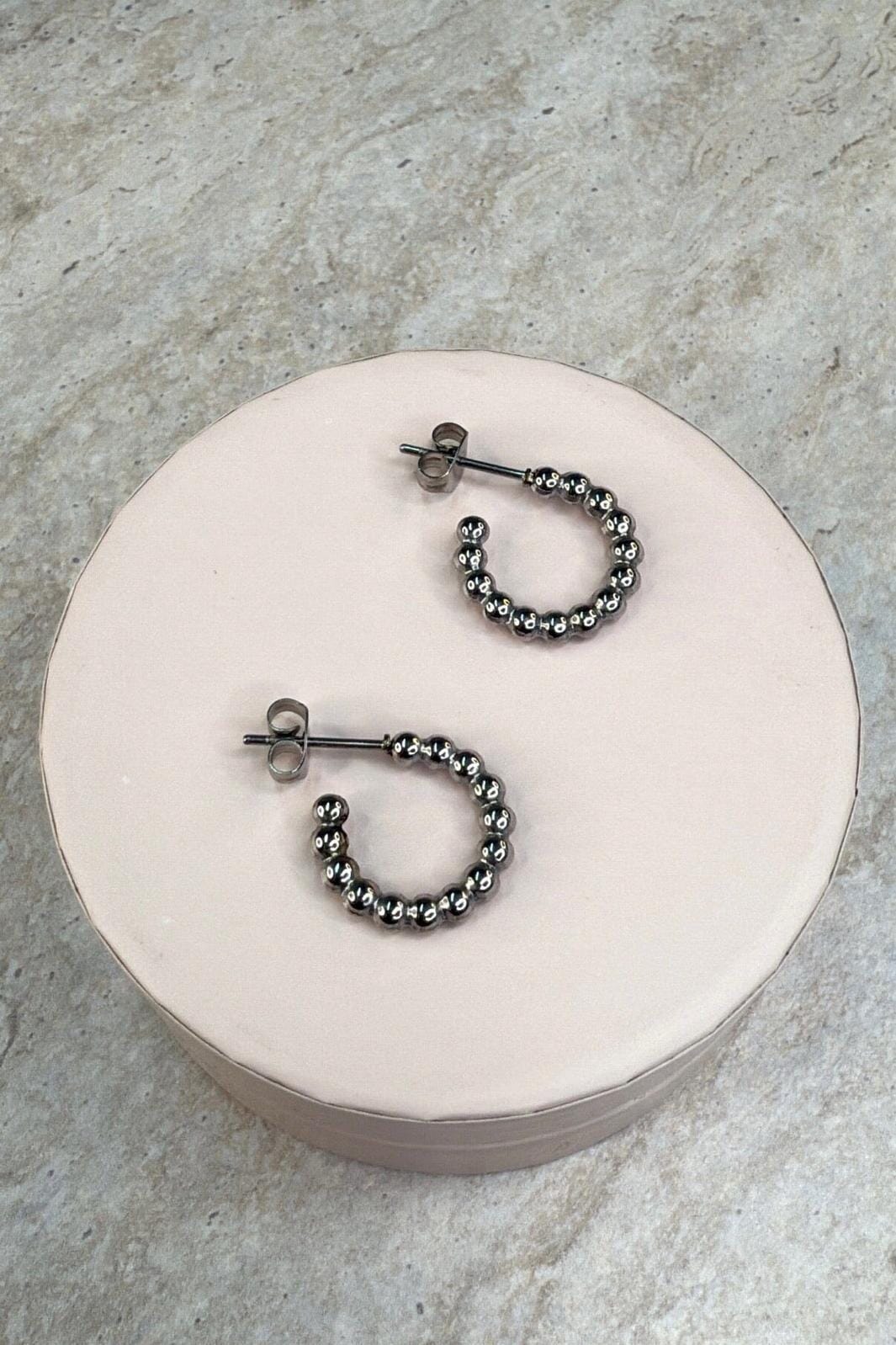 Hoop-øreringer fra Molly&My Jewellery med et perlemønster. Små kuler danner en sirkelformet bøyle i sølv.