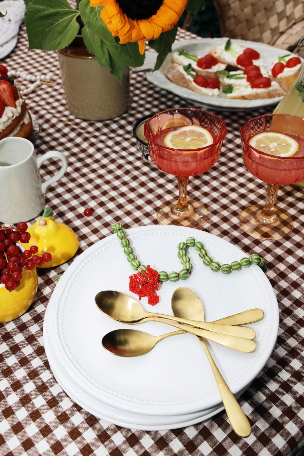 Et halskjede fra Molly&My Jewellery x Caroline Dan med grønne porselensperler og et rødt hummeranheng av glass.