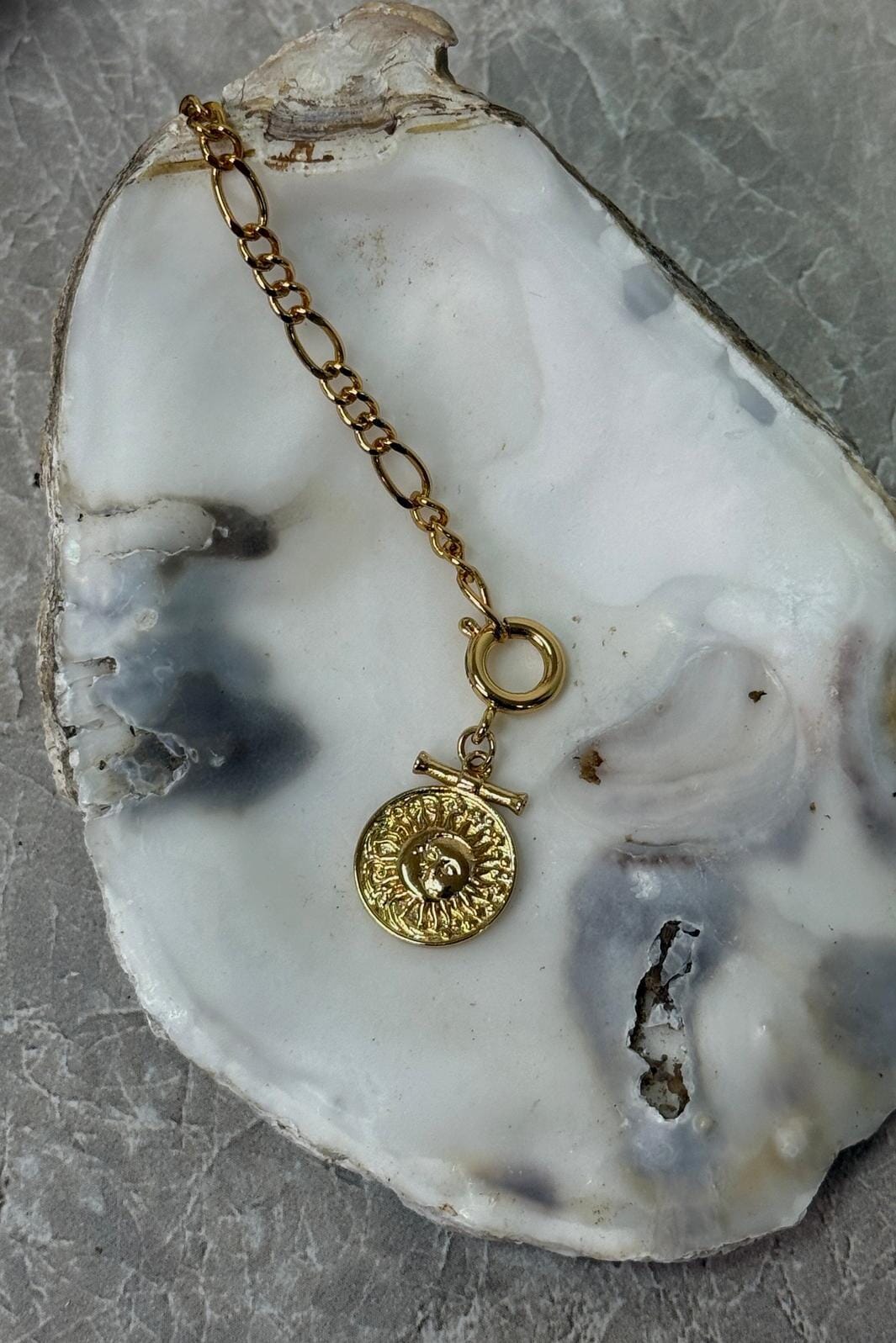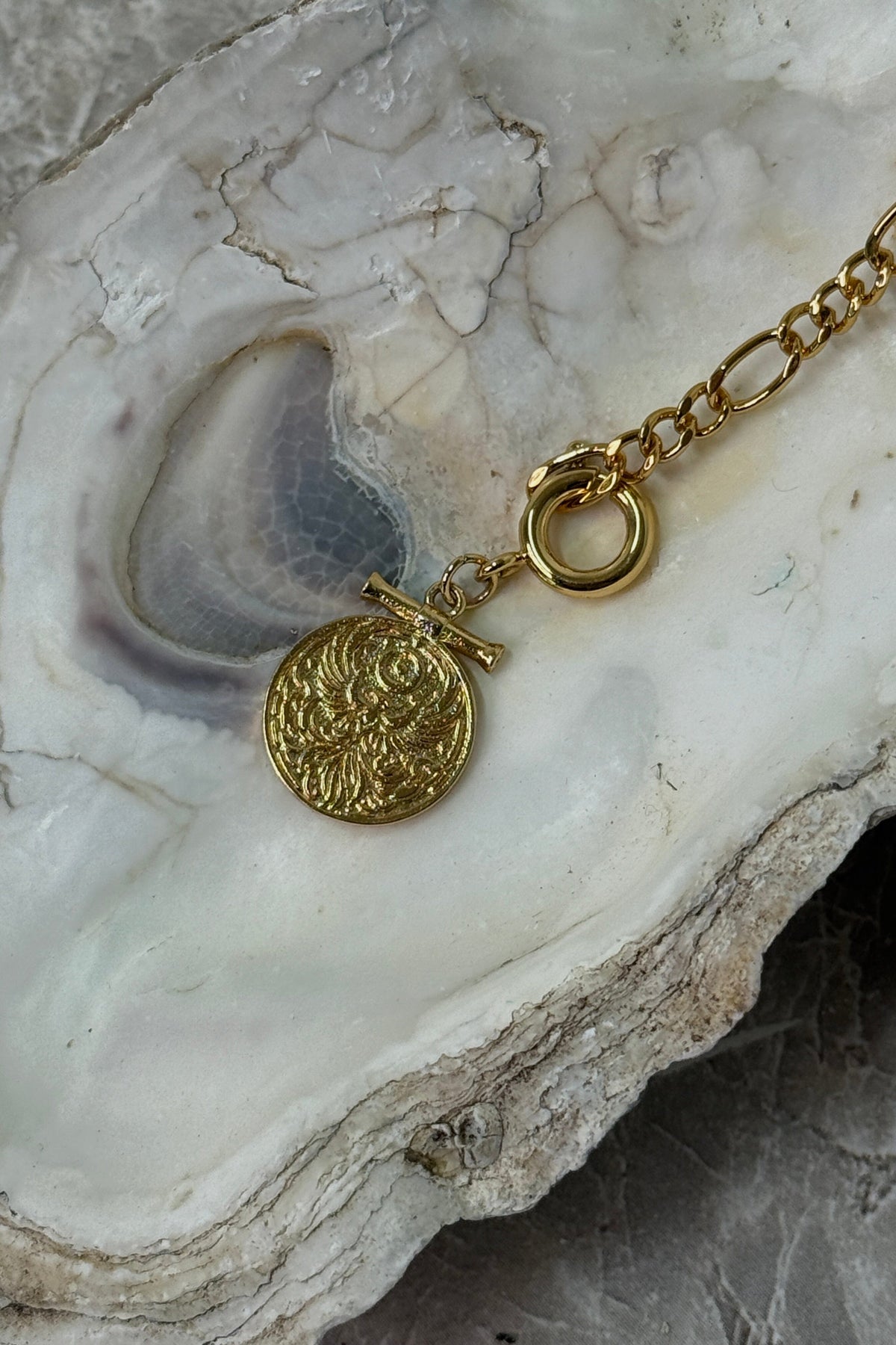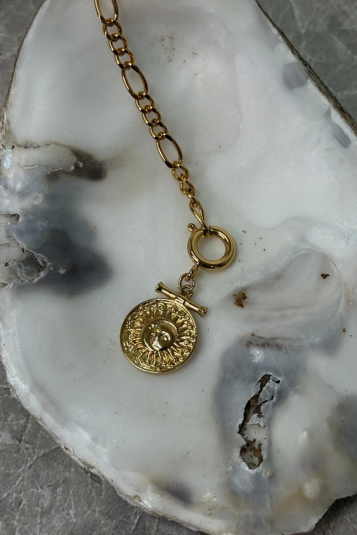 Forgylt medaljong i rustfritt stål fra Molly&My Jewellery x Melanie Due med inngravert sol- eller ansiktsdesign på en kjede med ovale ledd.