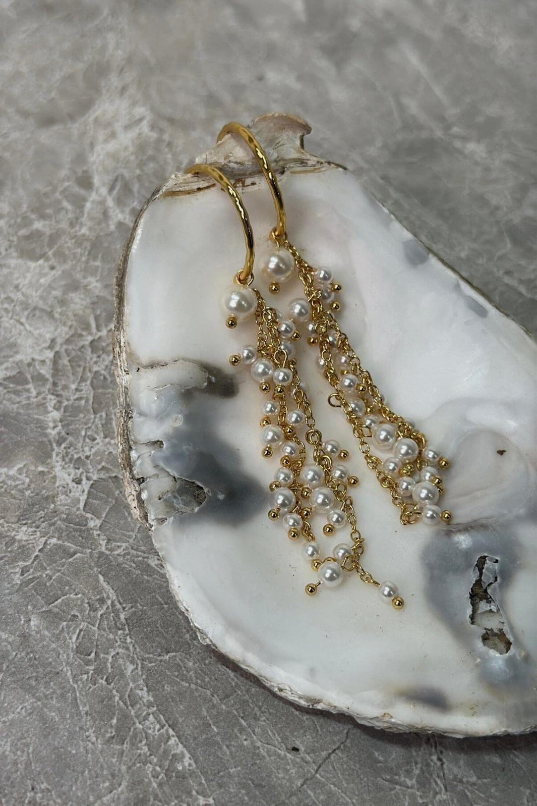 Forgylte øredobber fra Molly&My Jewellery x Melanie Due, laget av rustfritt stål med anheng av kjeder og perler.