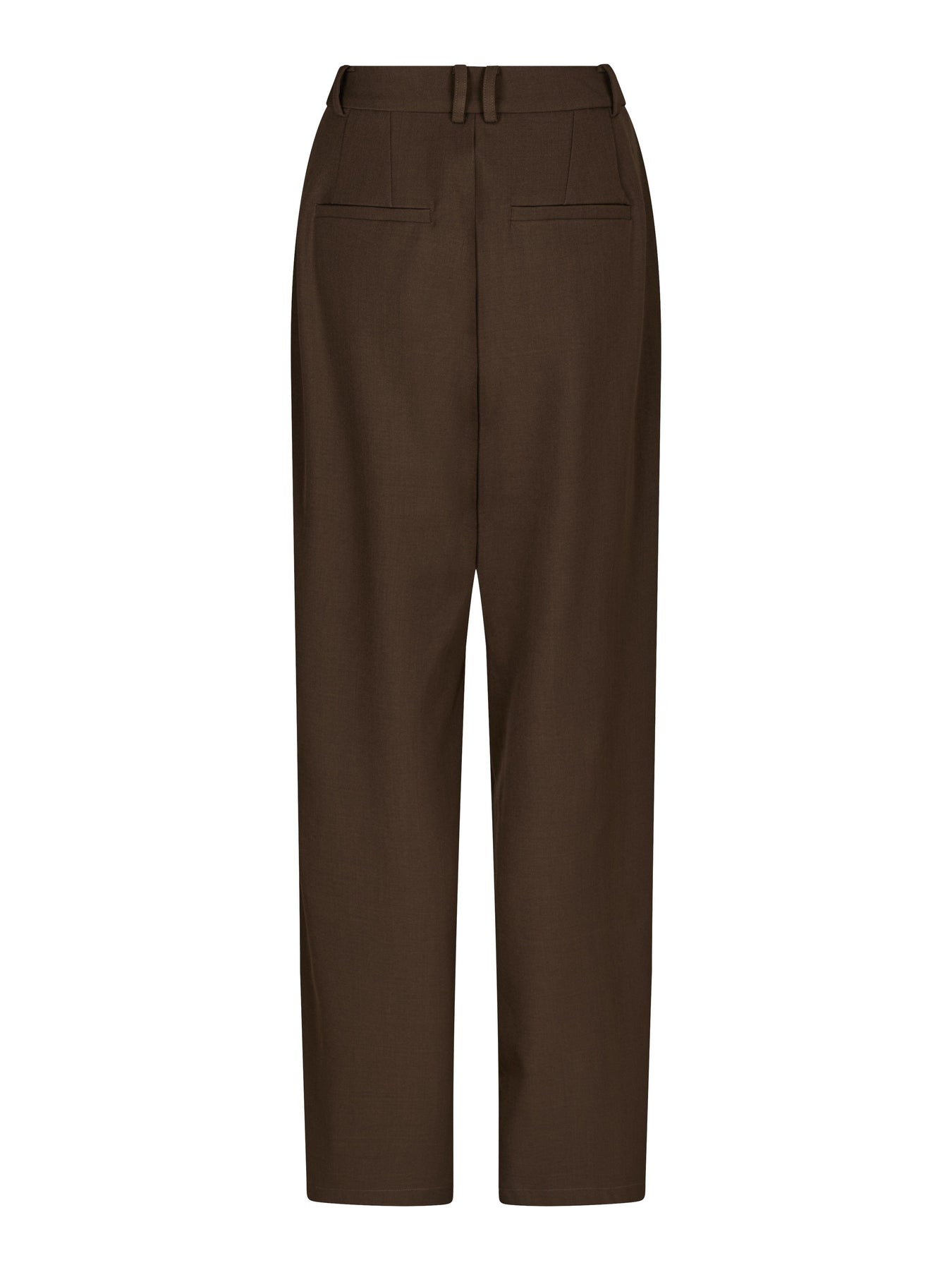 Mørkebrune bukser fra Molly&My x Julie Elgaard med en løs passform og gulvlengde. Buksene har høyt liv og lukkes med glidelås og knapper.